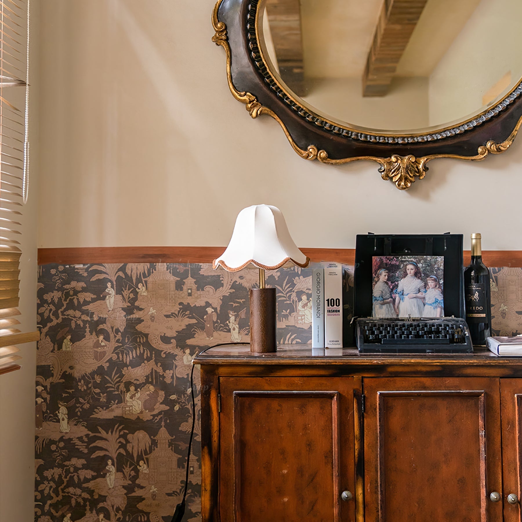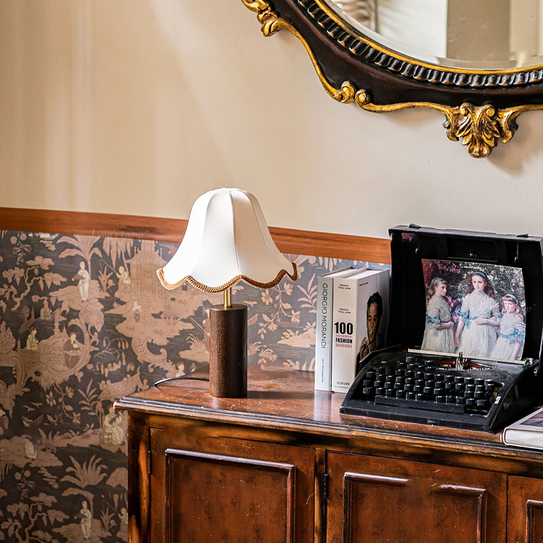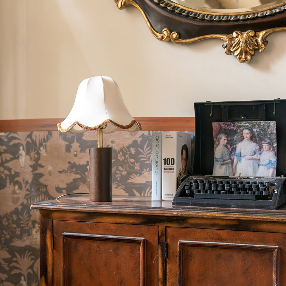 Bring et element af tidløs elegance ind i dit hjem med denne bordlampe. Den har en smukt udformet stofskærm med delikate bølgede kanter, kombineret med en robust træbase. Denne raffinerede lampe blander traditionel charme med moderne sofistikering, hvilket gør den til et alsidigt supplement til ethvert rum.