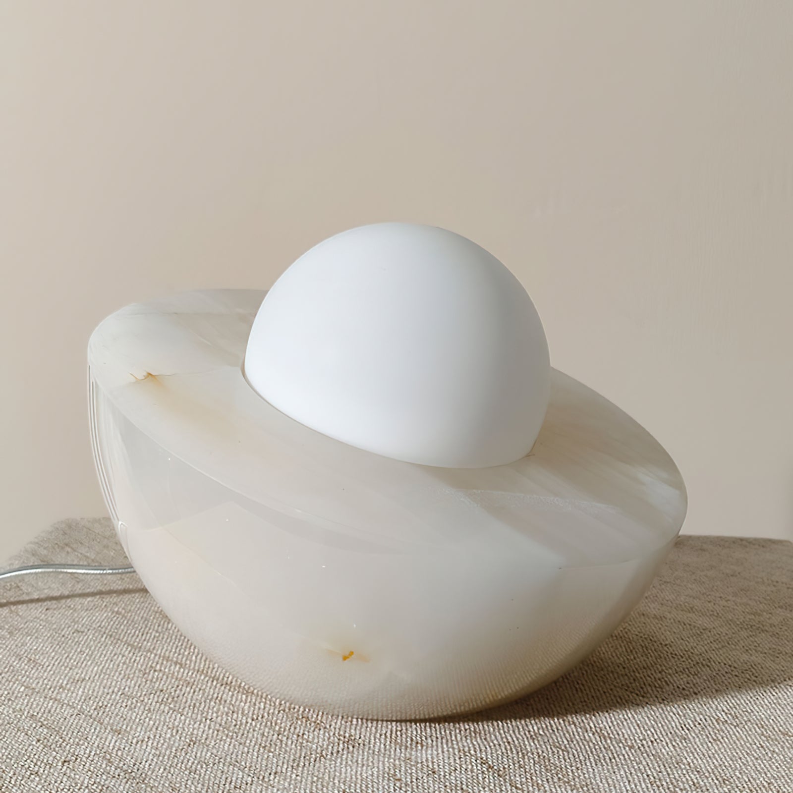 Piccola bordlampen er et minimalistisk mesterværk, der kombinerer den naturlige elegance af marmor med det bløde skær af frostet glas. Den slanke, skulpturelle form ligner en svævende planet, med en glat glasglobus, der blidt hviler på den udskårne marmorbasis. Den harmoniske kombination af materialer skaber en beroligende æstetik, perfekt til moderne interiører, der værdsætter enkelhed og raffinement.