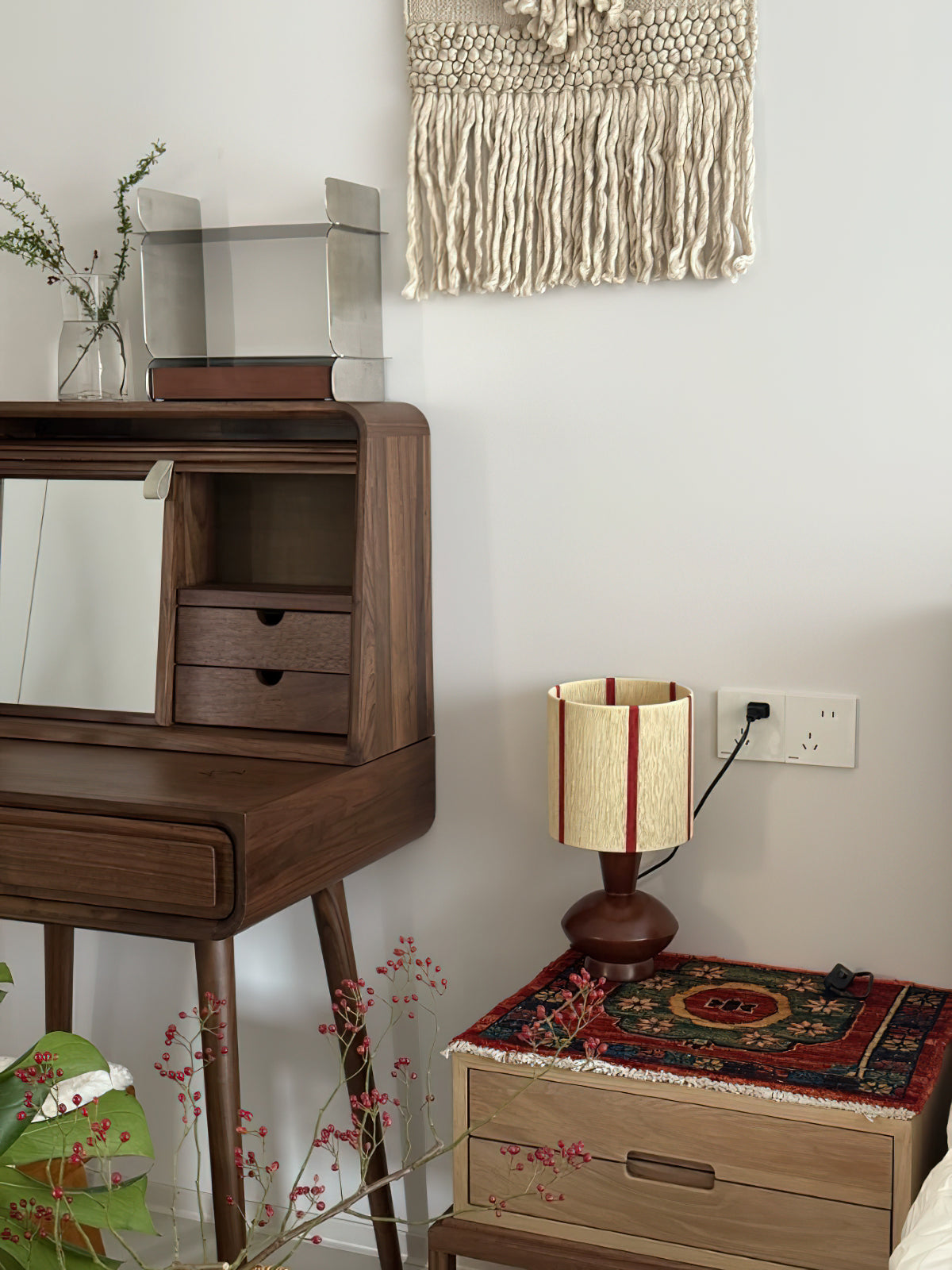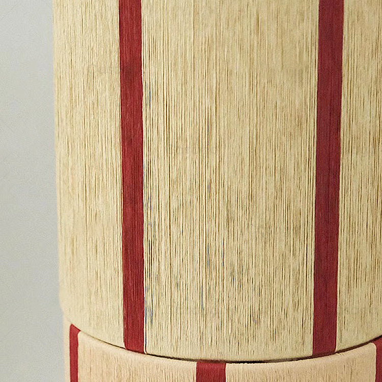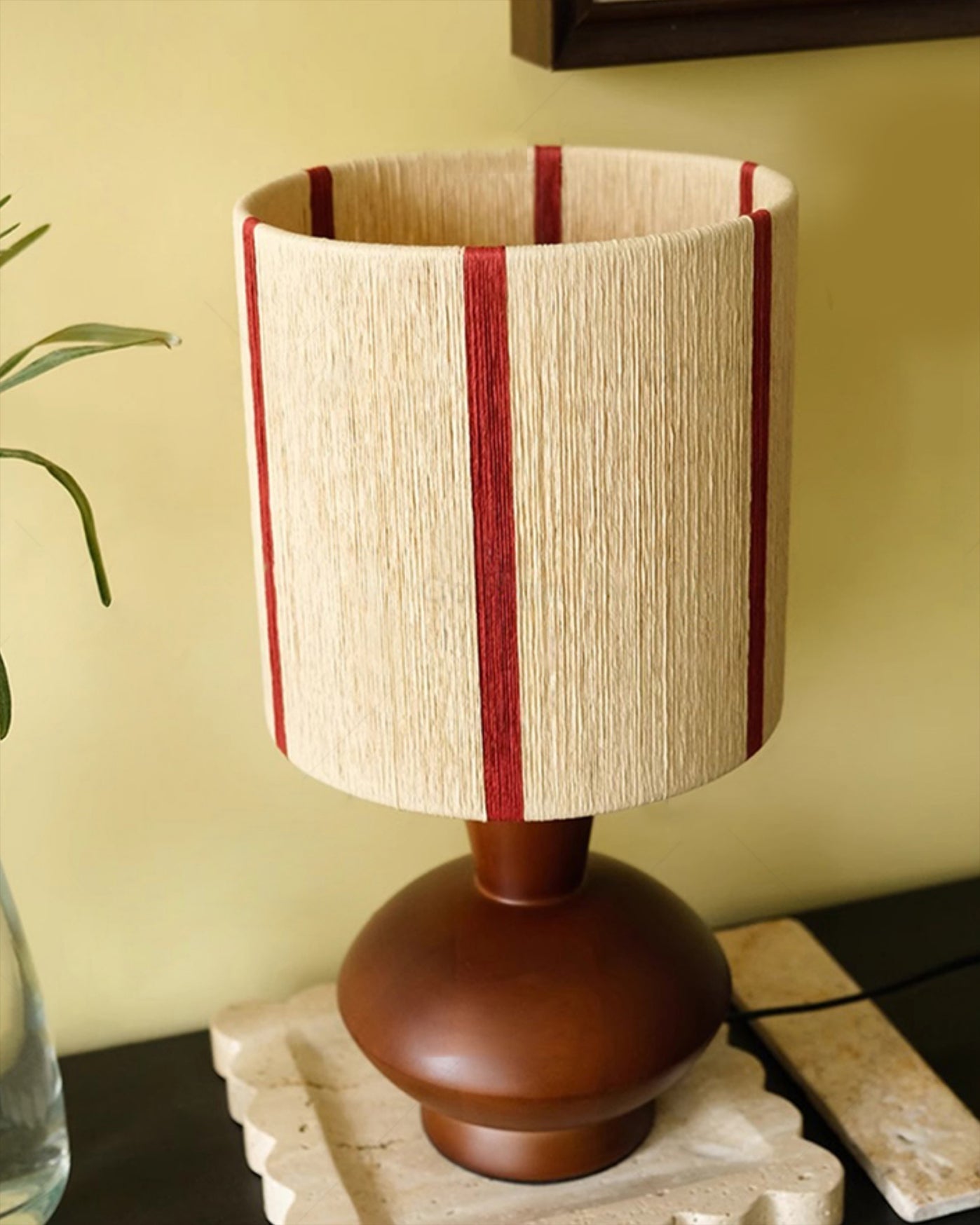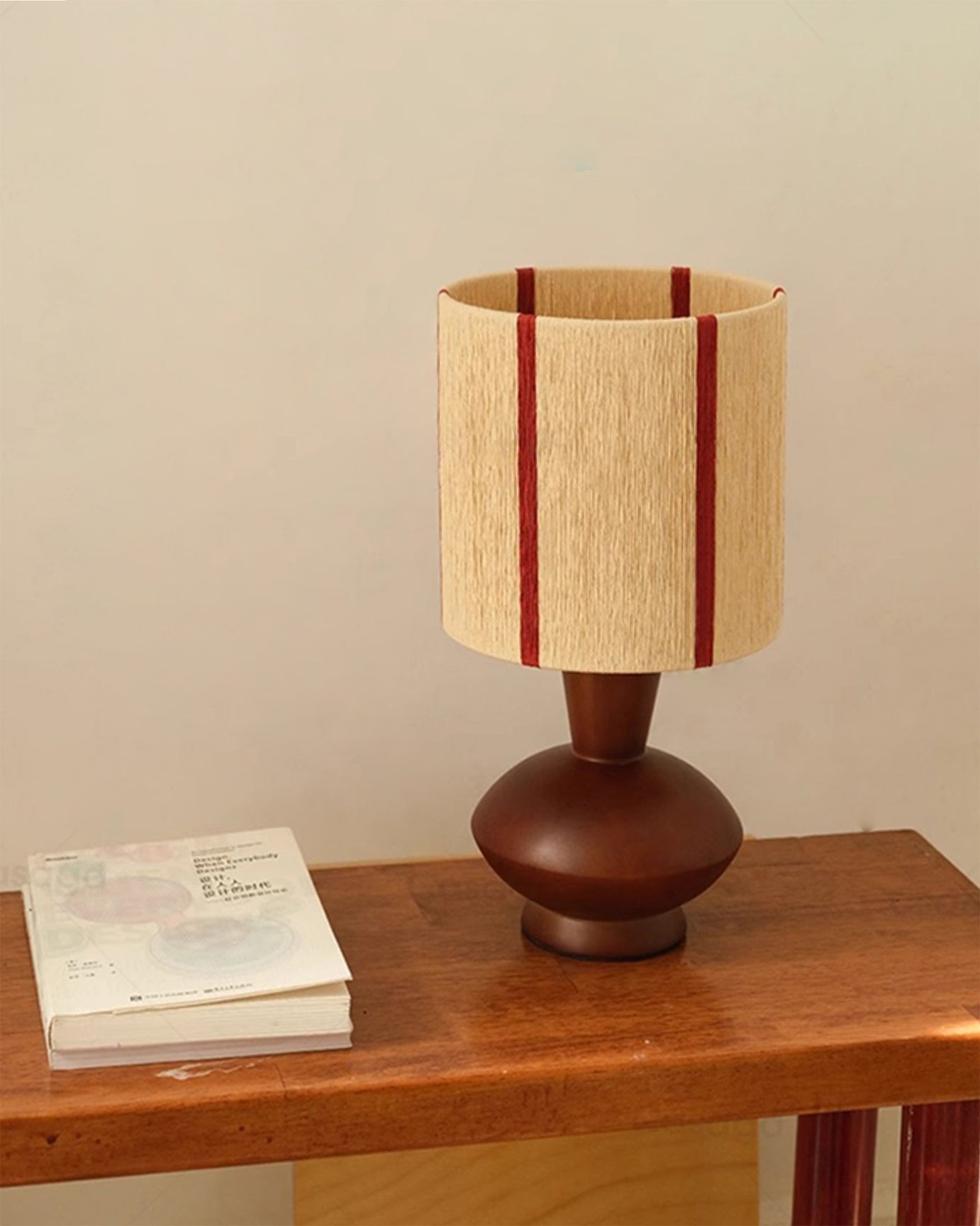 - Unik design: Lampen kombinerer en varm træbase med en cylindrisk lampeskærm med røde striber på en beige baggrund, hvilket skaber et dristigt udseende.