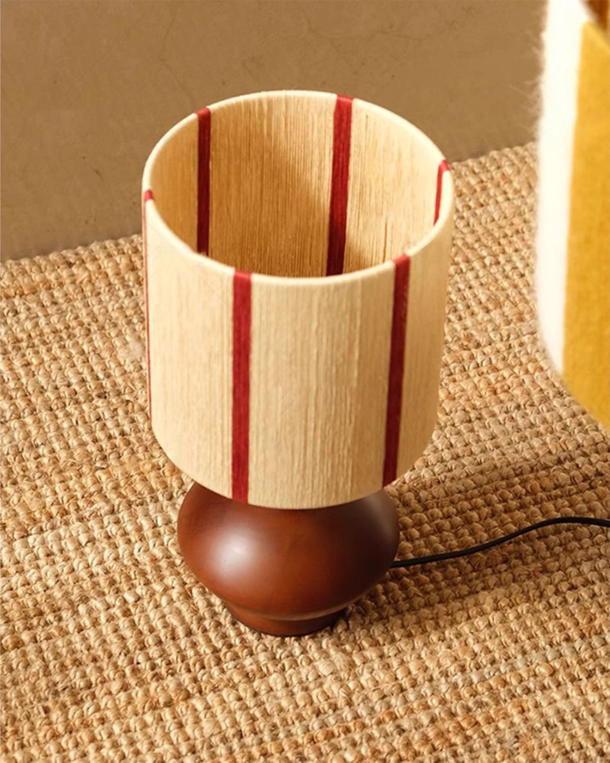 Ernest bordlampen fra Dekorfine udstråler tidløs elegance med en unik blanding af naturlige teksturer og dristige designs. Den varme træbase og den cylindriske lampeskærm med dybe røde striber på en naturlig beige baggrund giver lampen karakter og varme. Perfekt til skriveborde, natborde eller hyggelige hjørner, tilbyder denne lampe både funktionalitet og stilfuld æstetik.
