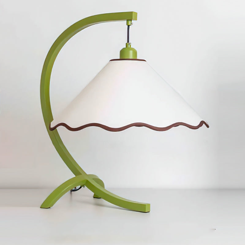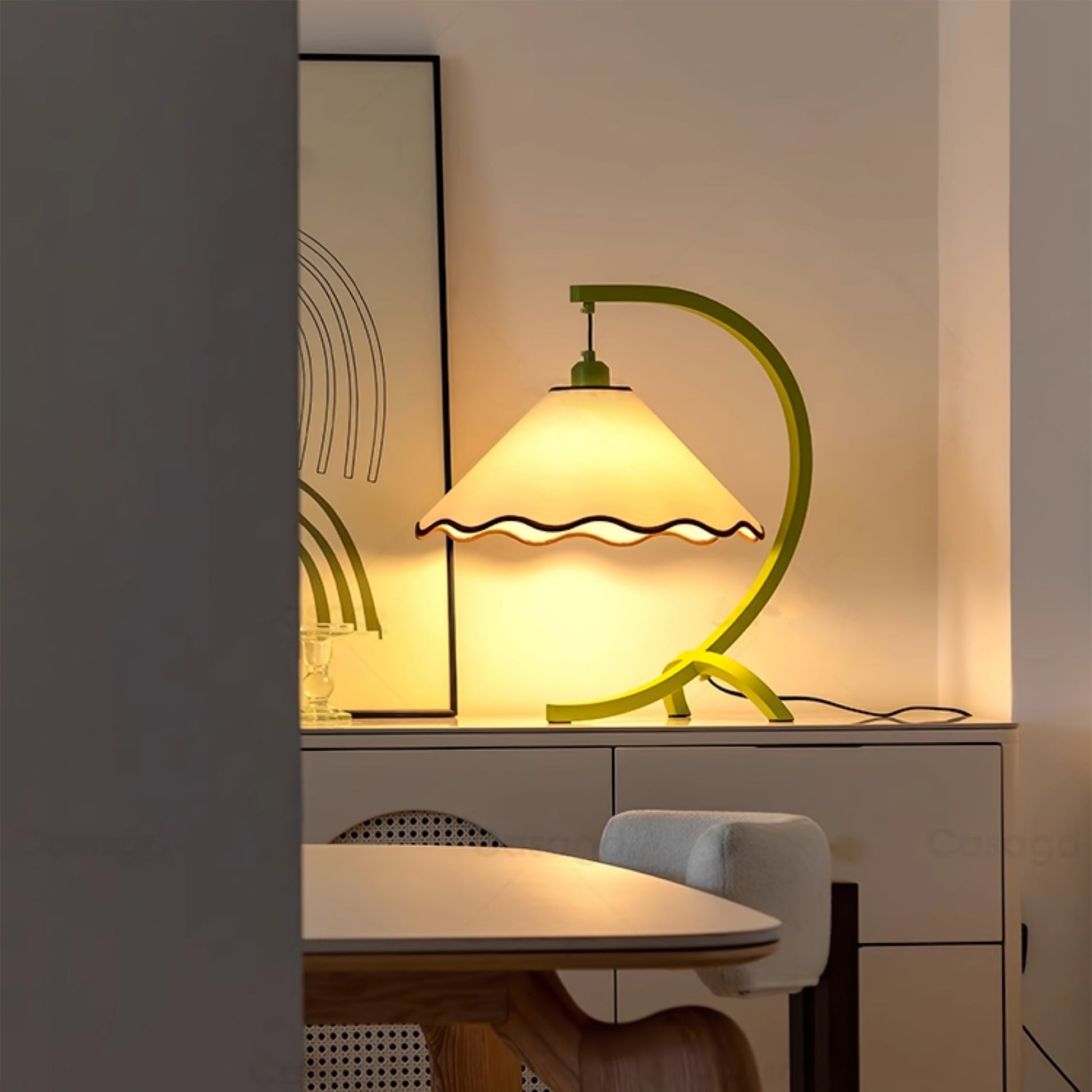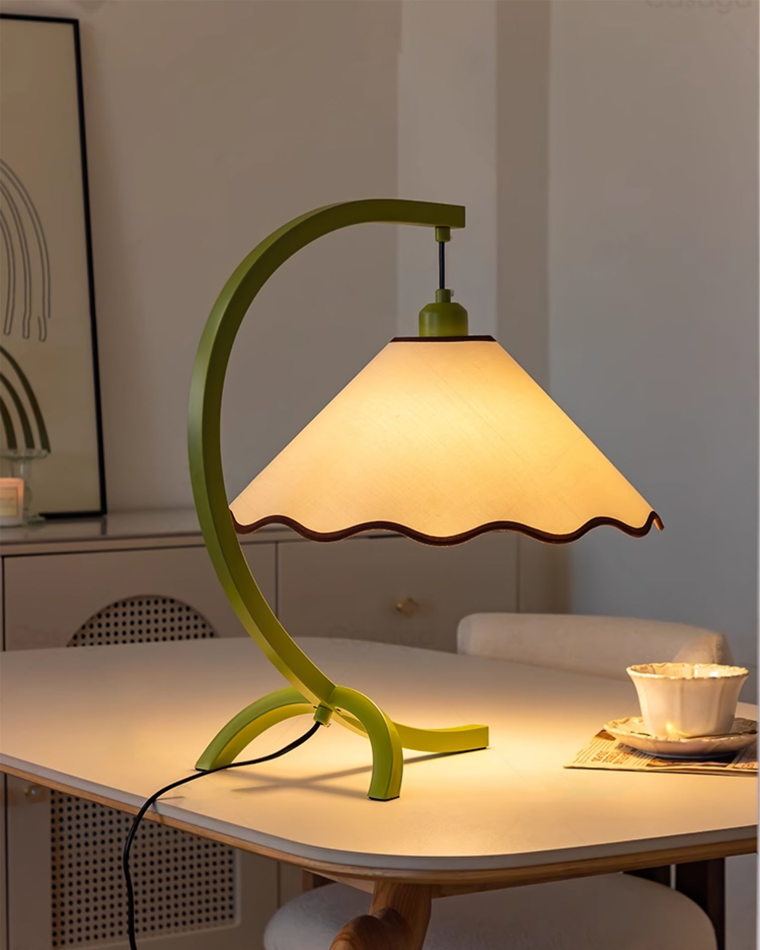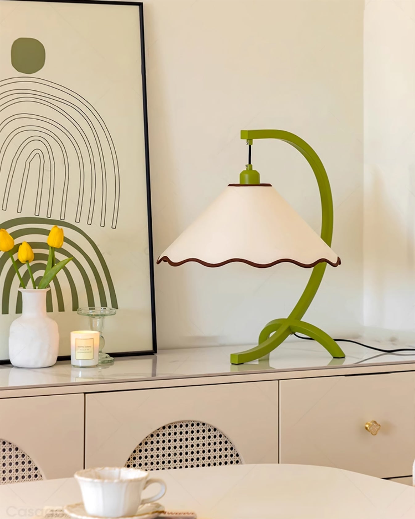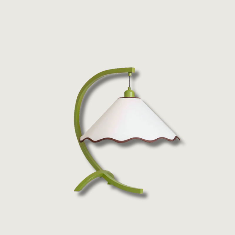 Kira Bordlampen tilføjer et legende præg til din indretning. Med en unik buet grøn ramme og en charmerende scalloped skygge kombinerer denne lampe retro stil med et moderne twist. Den bløde hvide skygge diffunderer lyset smukt og skaber en varm og indbydende atmosfære. Perfekt til natborde, skriveborde eller som et iøjnefaldende accent i stuen, er Kira Bordlampen et stilfuldt supplement, der tilføjer personlighed og farve til ethvert rum.