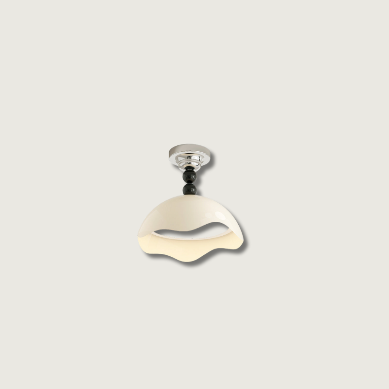 Tilføj et strejf af elegance til dit interiør med LuxeCrest loftlampen. Denne moderne lampe har en harmonisk blanding af creme- og sorte farver med et stilfuldt og raffineret design. Fremstillet af metal af høj kvalitet har den en unik, bølget cremefarvet skærm, der smukt diffunderer lyset og skaber en varm og indbydende atmosfære. De slanke sorte accenter tilføjer et strejf af sofistikering, hvilket gør denne lampe perfekt til enhver indretningsstil.