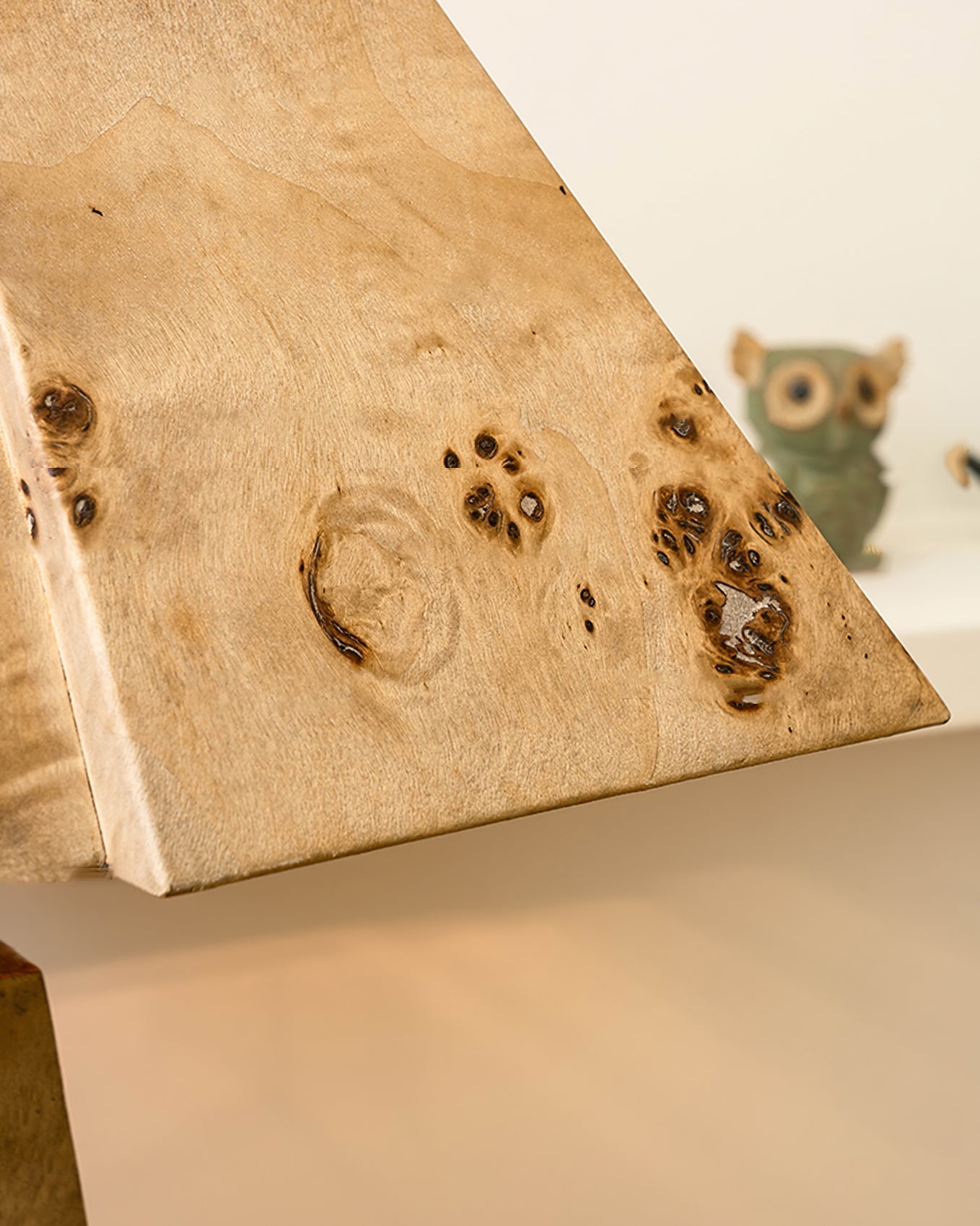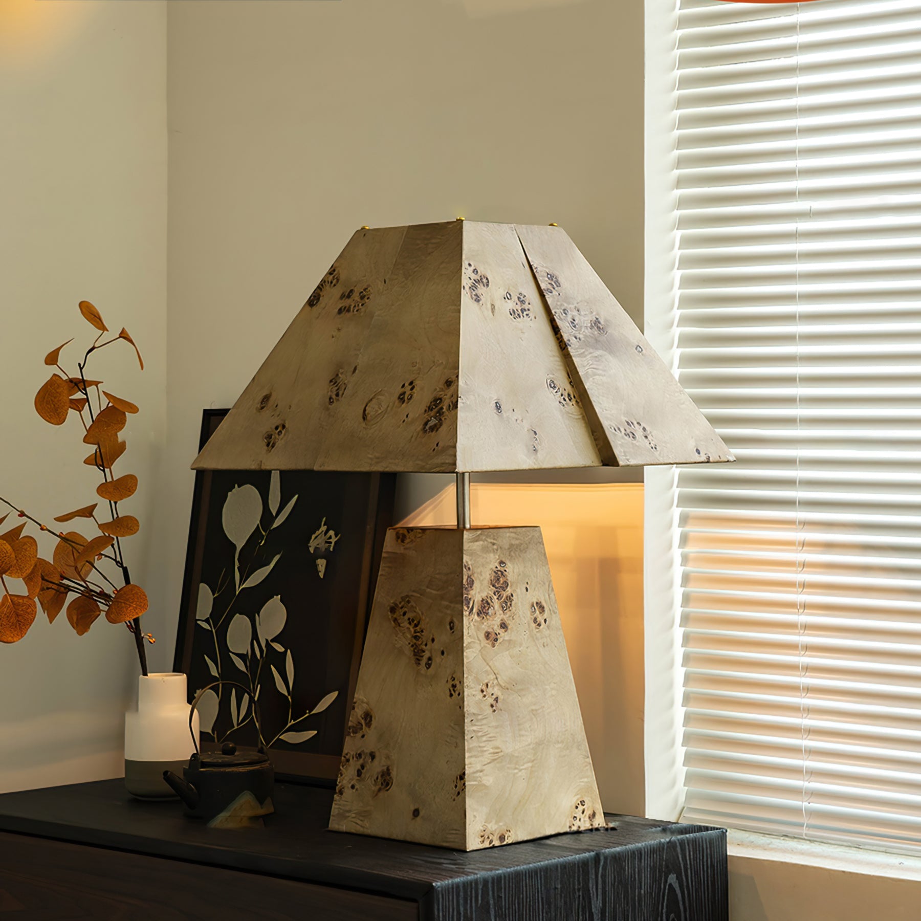 - Geometrisk design: Aftagelig træbase med en matchende træskygge.