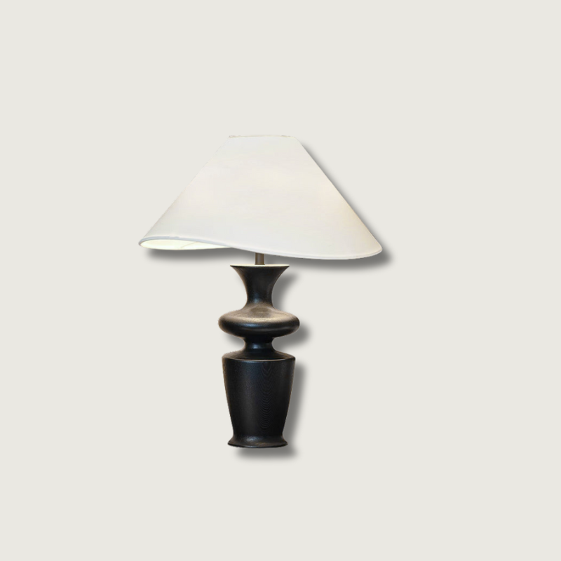 Denne bordlampe er et fantastisk stykke, der blander moderne design med klassisk elegance. Den er lavet af højkvalitets træ og stof og har en unikt formet base med kurver, der tilføjer et strejf af sofistikering til ethvert rum. Den asymmetrisk stofskærm giver den et moderne udseende, hvilket gør den til et alsidigt valg til både traditionelle og moderne interiører. Det varme lys og det kunstneriske design gør denne lampe til mere end bare en lyskilde, men til et statement-stykke i dit hjem. Perfekt til at skabe en hyggelig atmosfære i din stue.