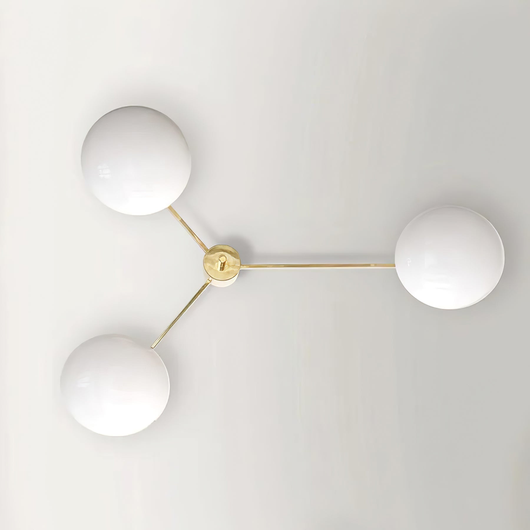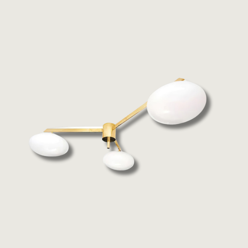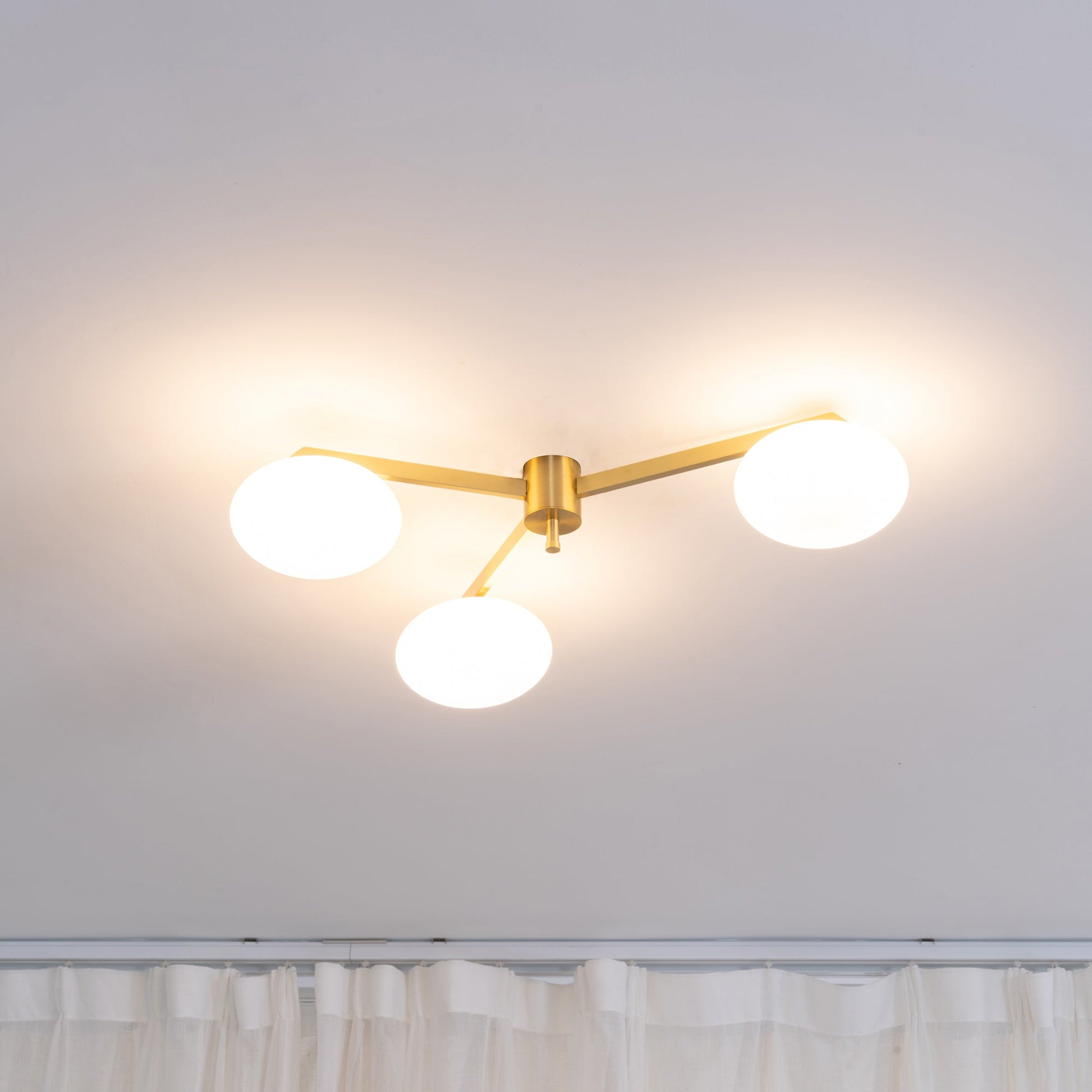Perfekt element til at skabe en raffineret, men imødekommende atmosfære i ethvert interiør. De opaline glaslamper, inspireret af perleknapper, hænger fra messingarme og skaber et moderne og minimalistisk udseende. Med sin slanke silhuet tæt på loftet hylder denne lampe Art Deco-stilen og passer perfekt ind i soveværelser, gange, køkkener og andre rum i dit hjem.