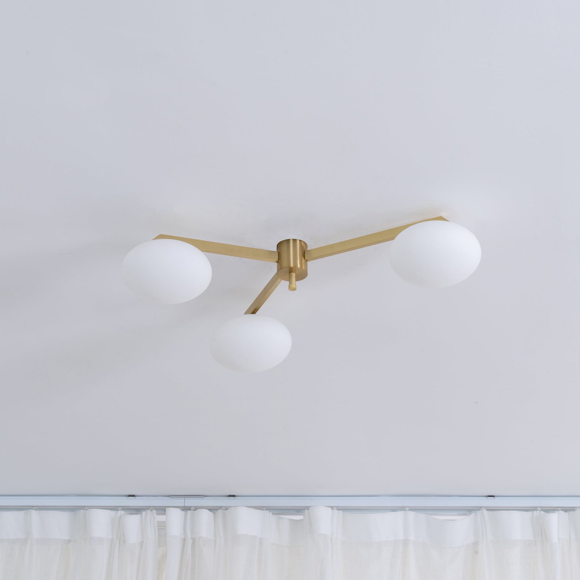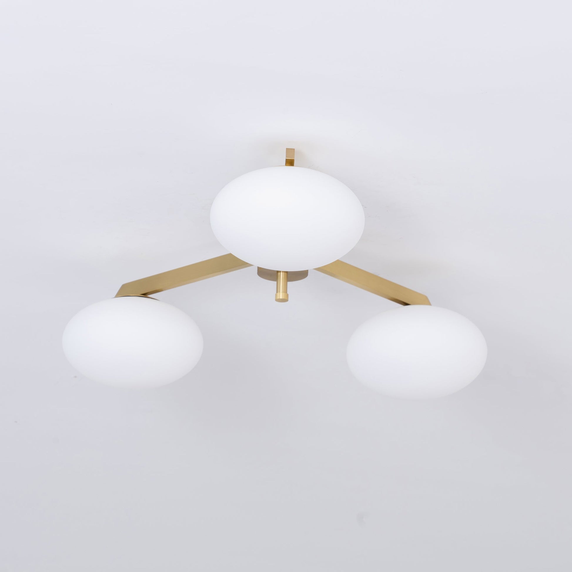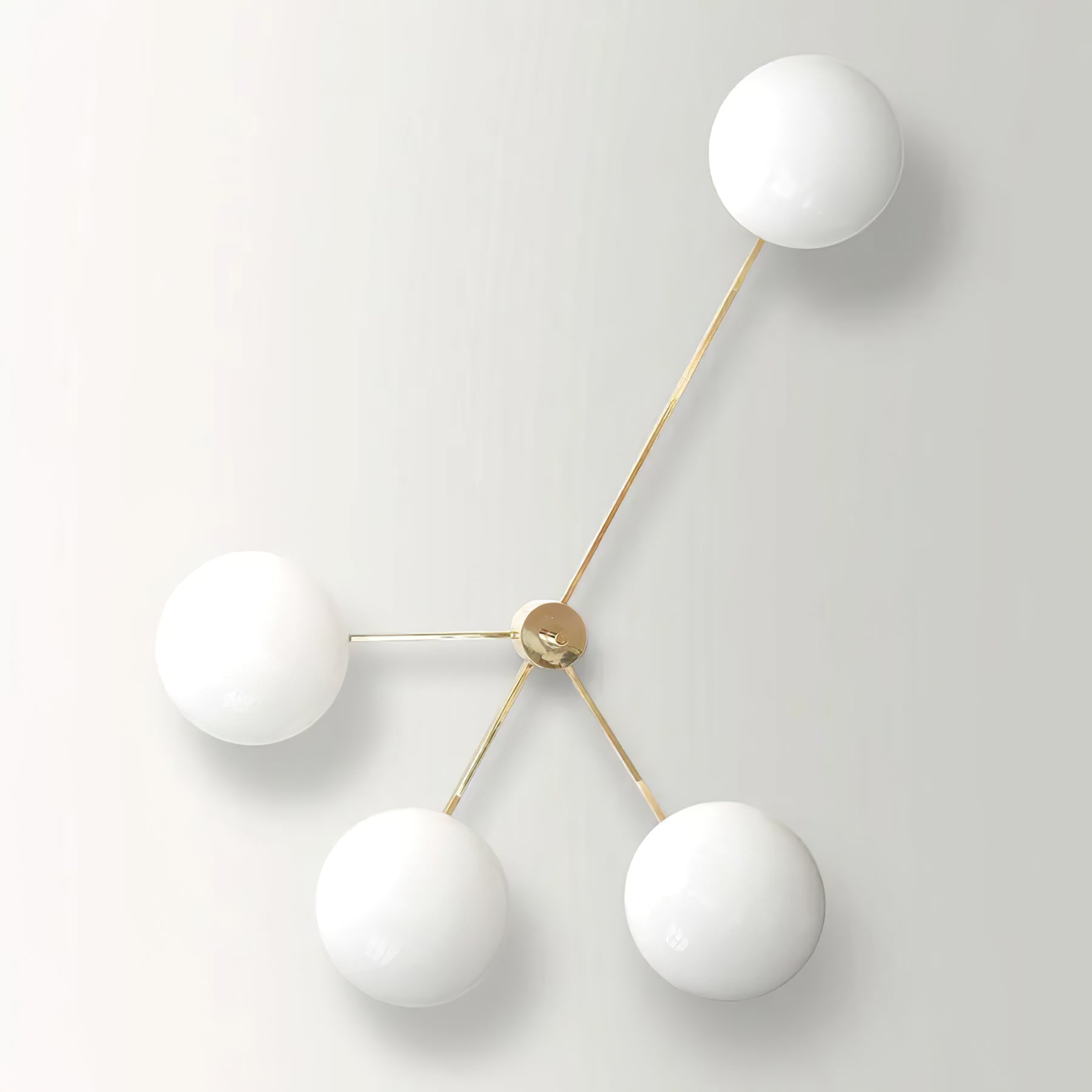 Perfekt element til at skabe en raffineret, men imødekommende atmosfære i ethvert interiør. De opaline glaslamper, inspireret af perleknapper, hænger fra messingarme og skaber et moderne og minimalistisk udseende. Med sin slanke silhuet tæt på loftet hylder denne lampe Art Deco-stilen og passer perfekt ind i soveværelser, gange, køkkener og andre rum i dit hjem.