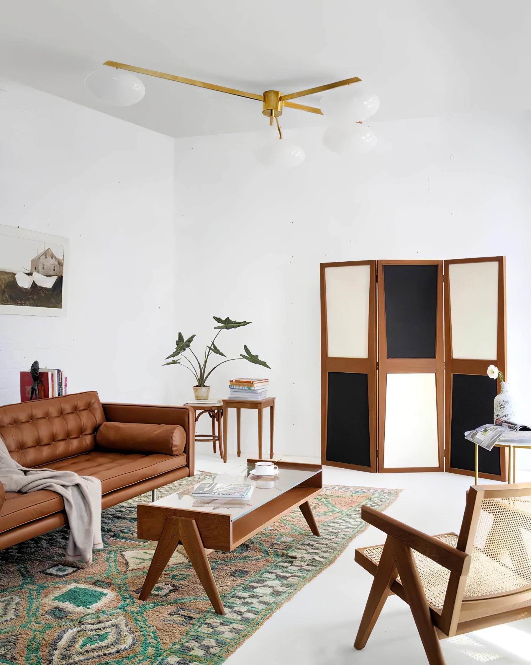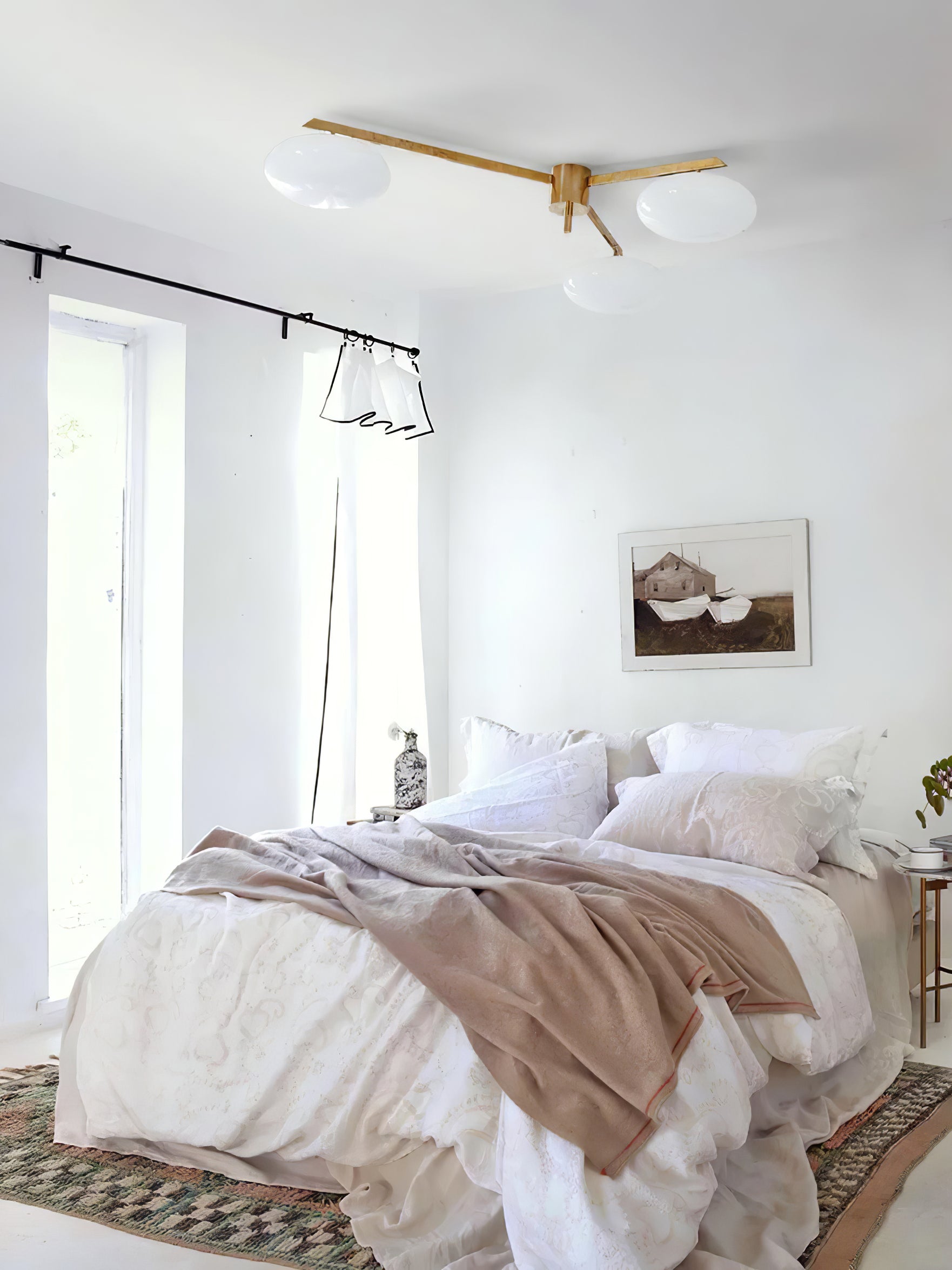 - Messing Finish: En raffineret kontrast til de hvide glaslampeskærme, perfekt til forskellige indretningsstile.