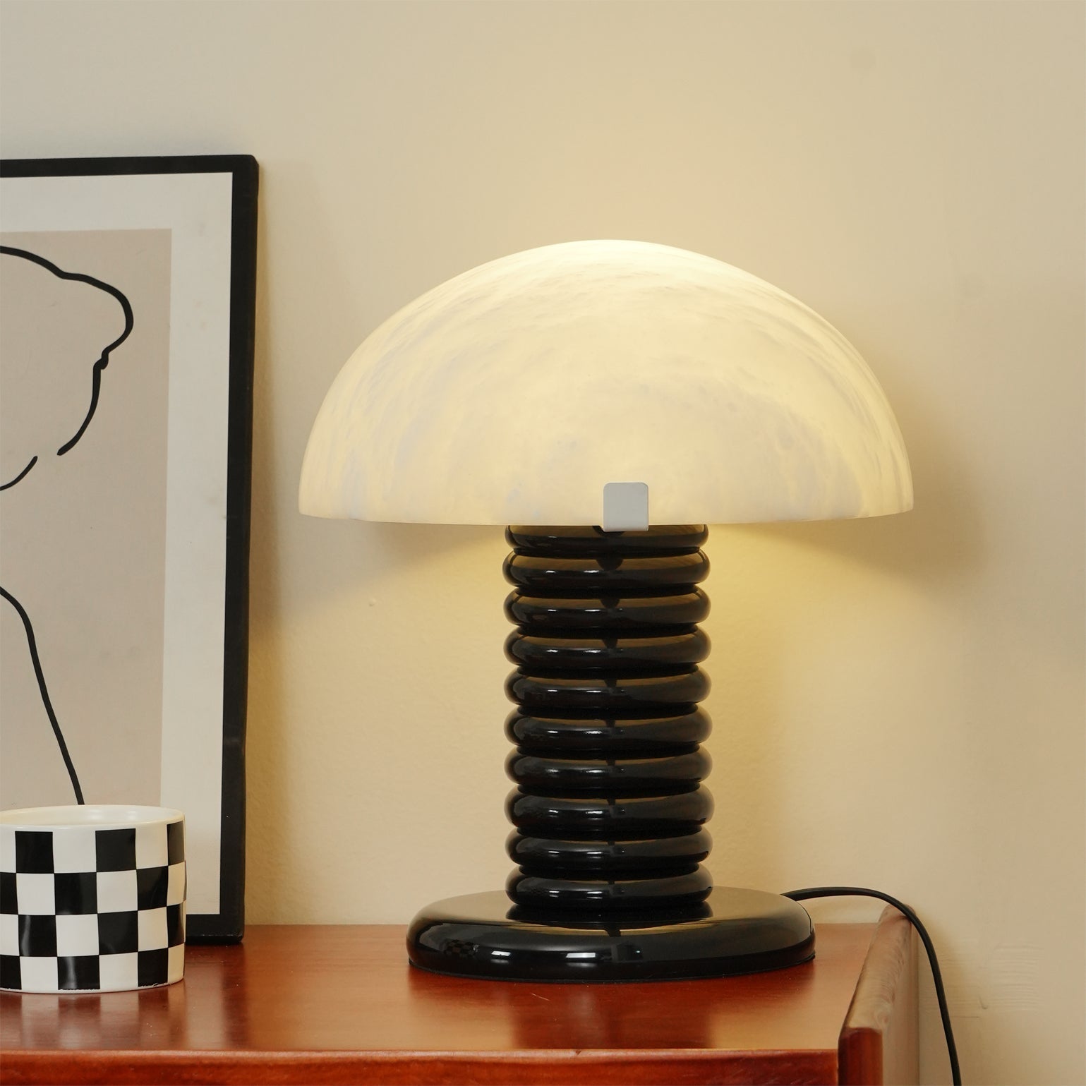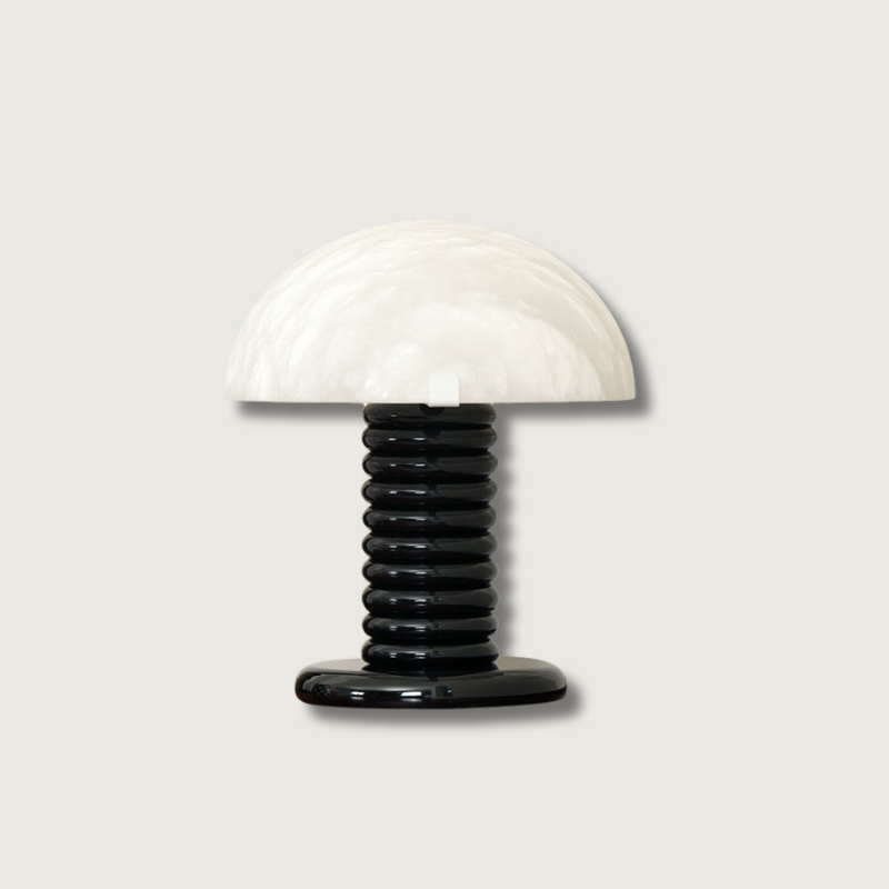 Forbedr din boligindretning med denne stemningsfulde bordlampe, et mesterværk af moderne design og tidløs elegance. Med en fantastisk alabaster lampeskærm og en slående sort ribbet base er denne bordlampe den perfekte kombination af form og funktion. Dens unikke og sofistikerede design gør den til et blikfang i ethvert rum, hvad enten det er dit stue, soveværelse eller kontor.