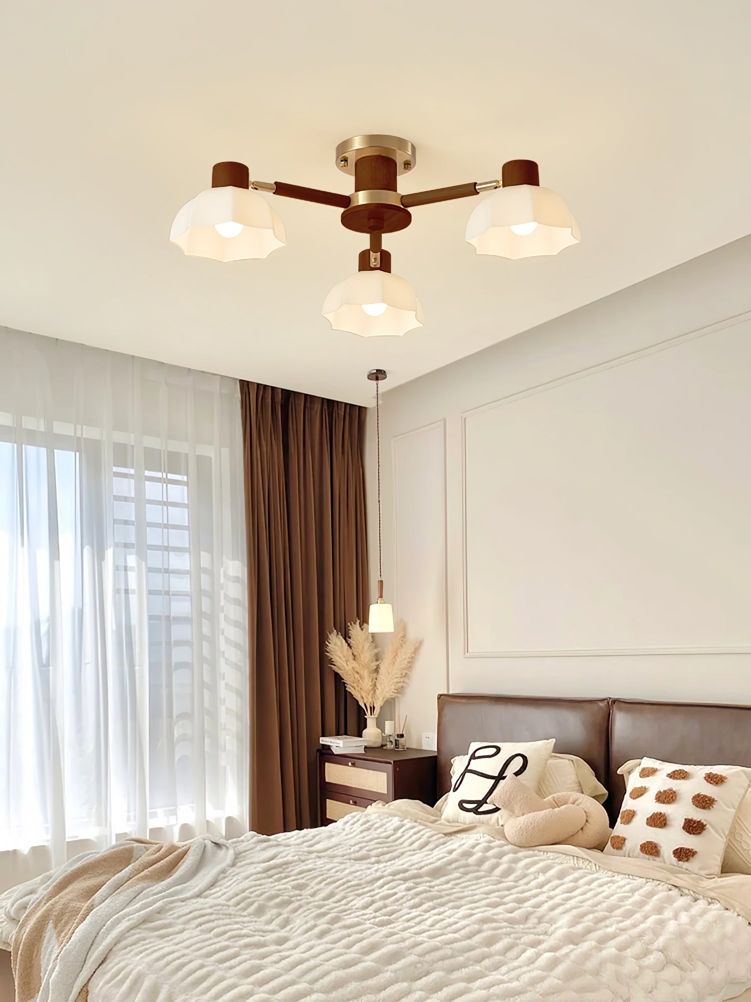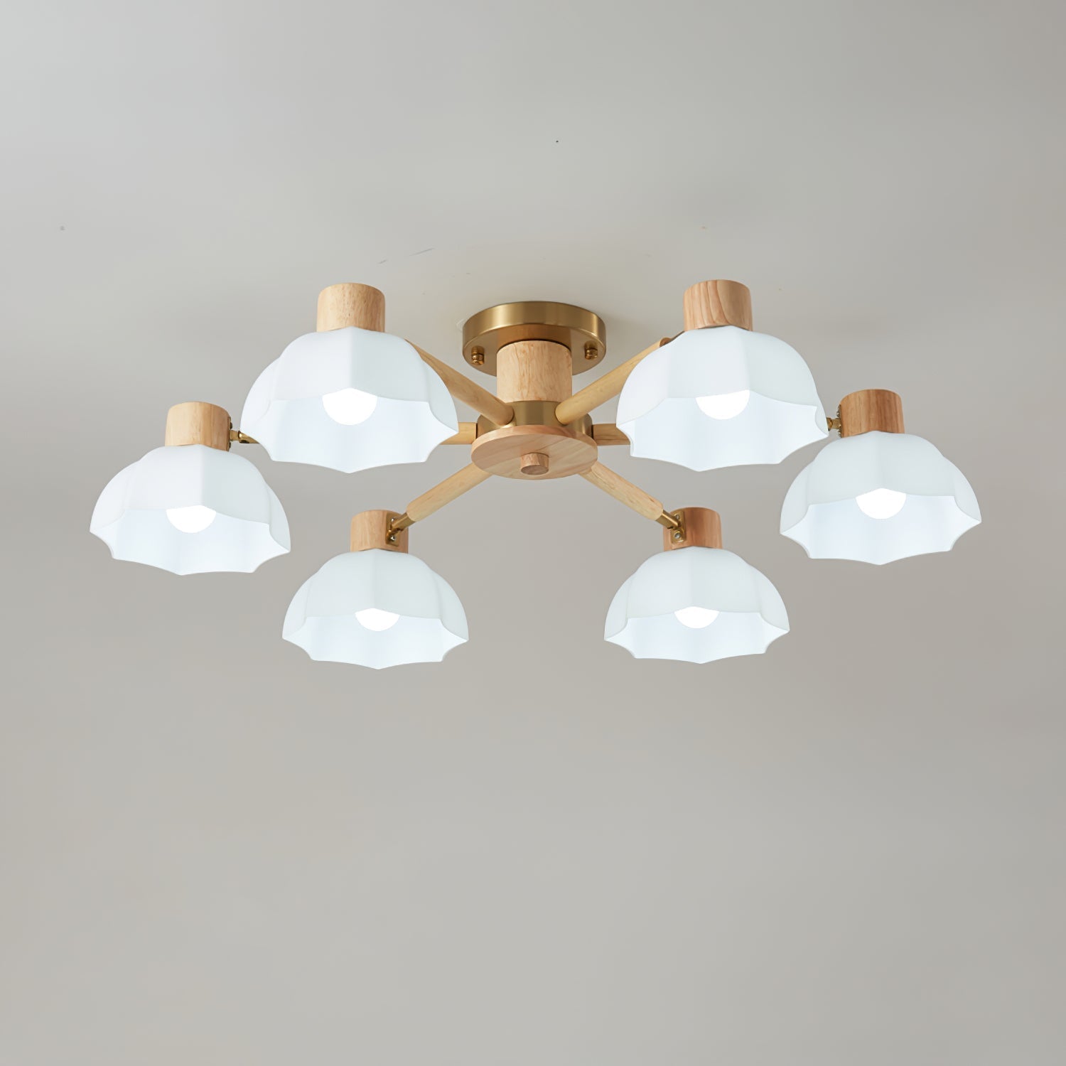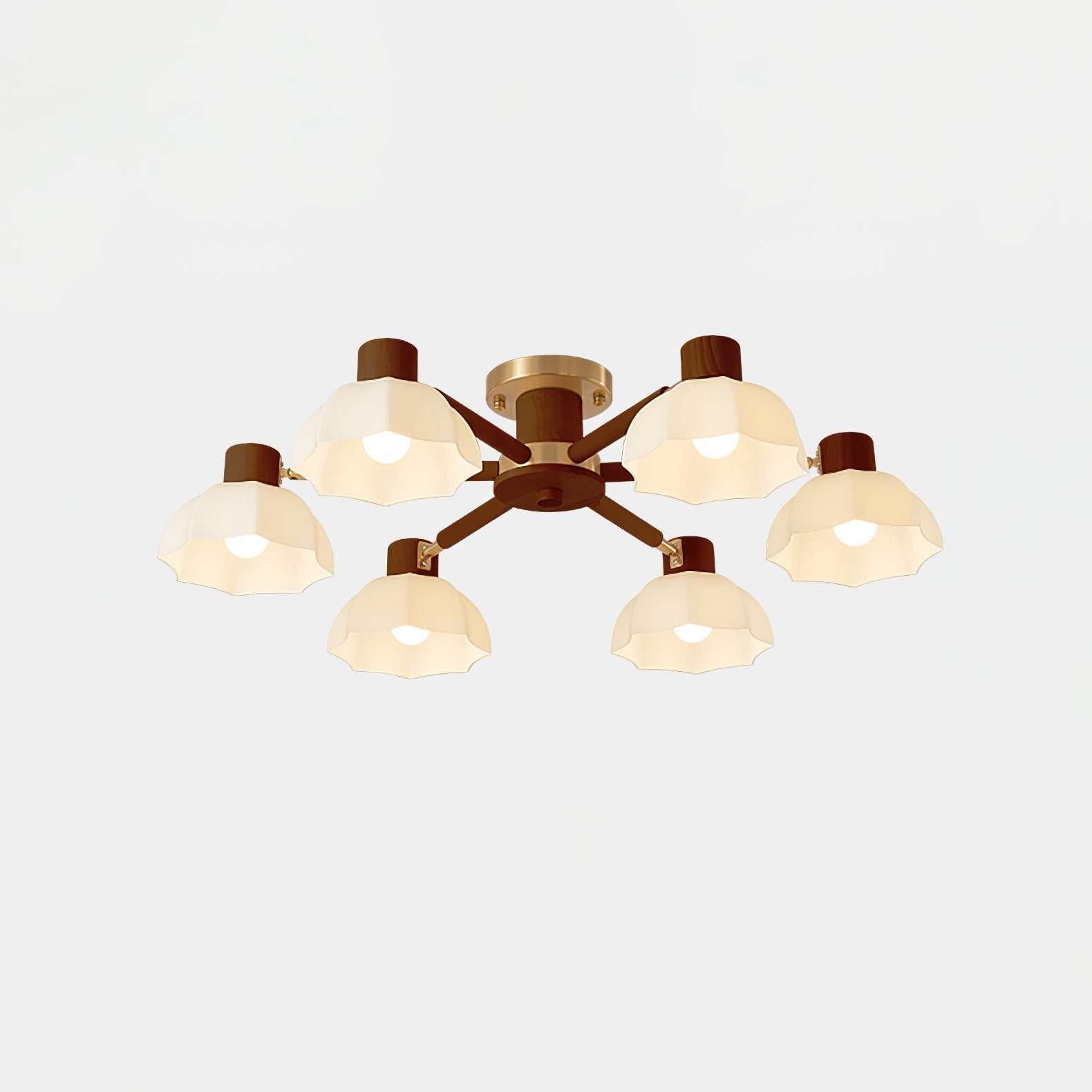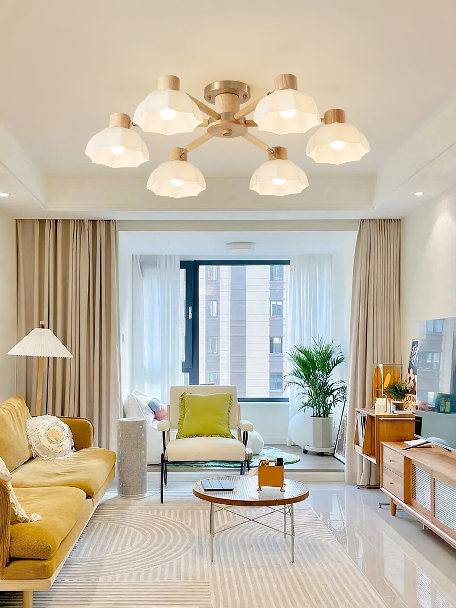 La lámpara de techo FloraAura es una opción de iluminación refinada pero impactante que añade un toque de encanto natural a cualquier habitación. El diseño recuerda a flores en plena floración, con elementos de madera y pantallas de lámpara de vidrio elegantemente acampanadas que imitan la suavidad de los pétalos. Esta combinación de madera natural, metal y vidrio crea una estética sofisticada pero orgánica, perfecta para interiores modernos, rústicos o inspirados en el estilo escandinavo.