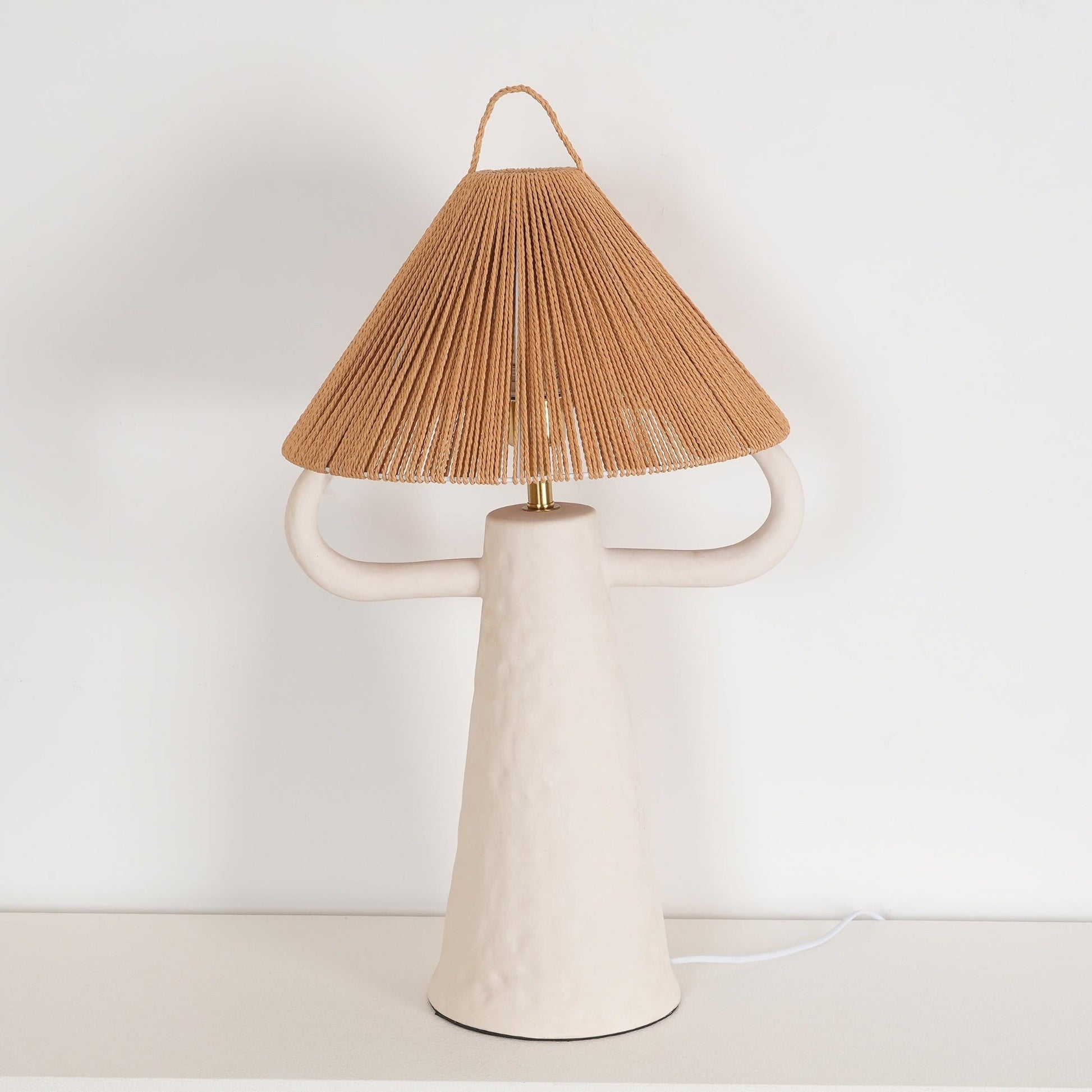 Porta calore e profondità al tuo interno con questa lampada da tavolo in ceramica, realizzata a mano in argilla e rifinita con smalto bianco opaco. Il elegante stelo scanalato e le braccia erette presentano un paralume in rafia naturale, perfetto per creare un'atmosfera rustica e terrosa. Un'aggiunta bellissima al tuo comodino o in qualsiasi spazio che richieda una raffinata sottigliezza.