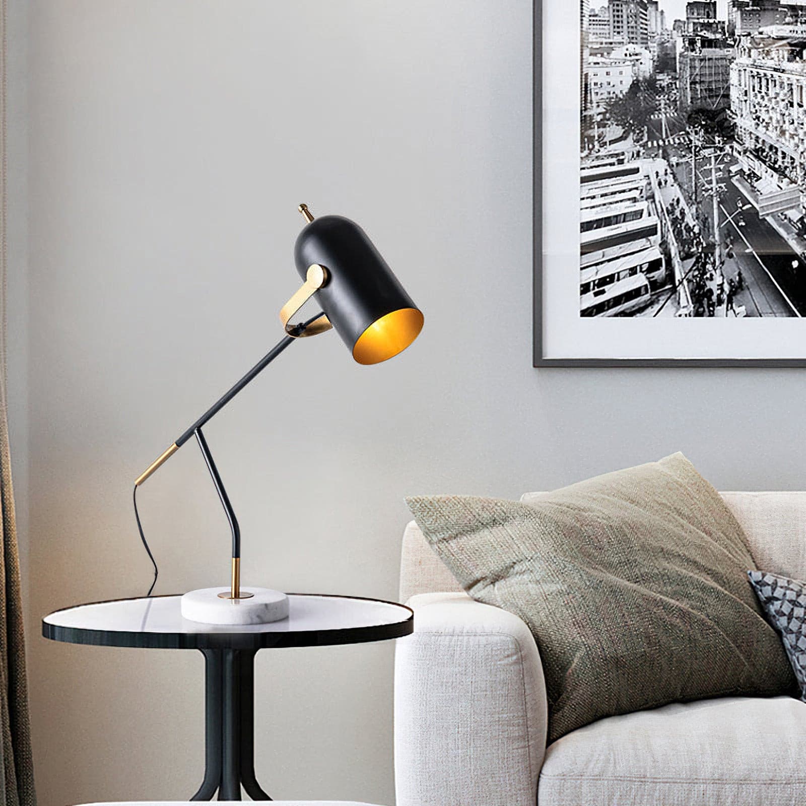 Z regulowanym fokusem, ta czarna i mosiężna lampa biurkowa jest idealnym towarzyszem biurka, niezależnie od tego, czy pracujesz nad zadaniem domowym, czy przeglądasz gazetę. Design jest nowoczesny i minimalistyczny, a jednocześnie przyciąga uwagę swoimi eleganckimi liniami i stylowym wykończeniem.