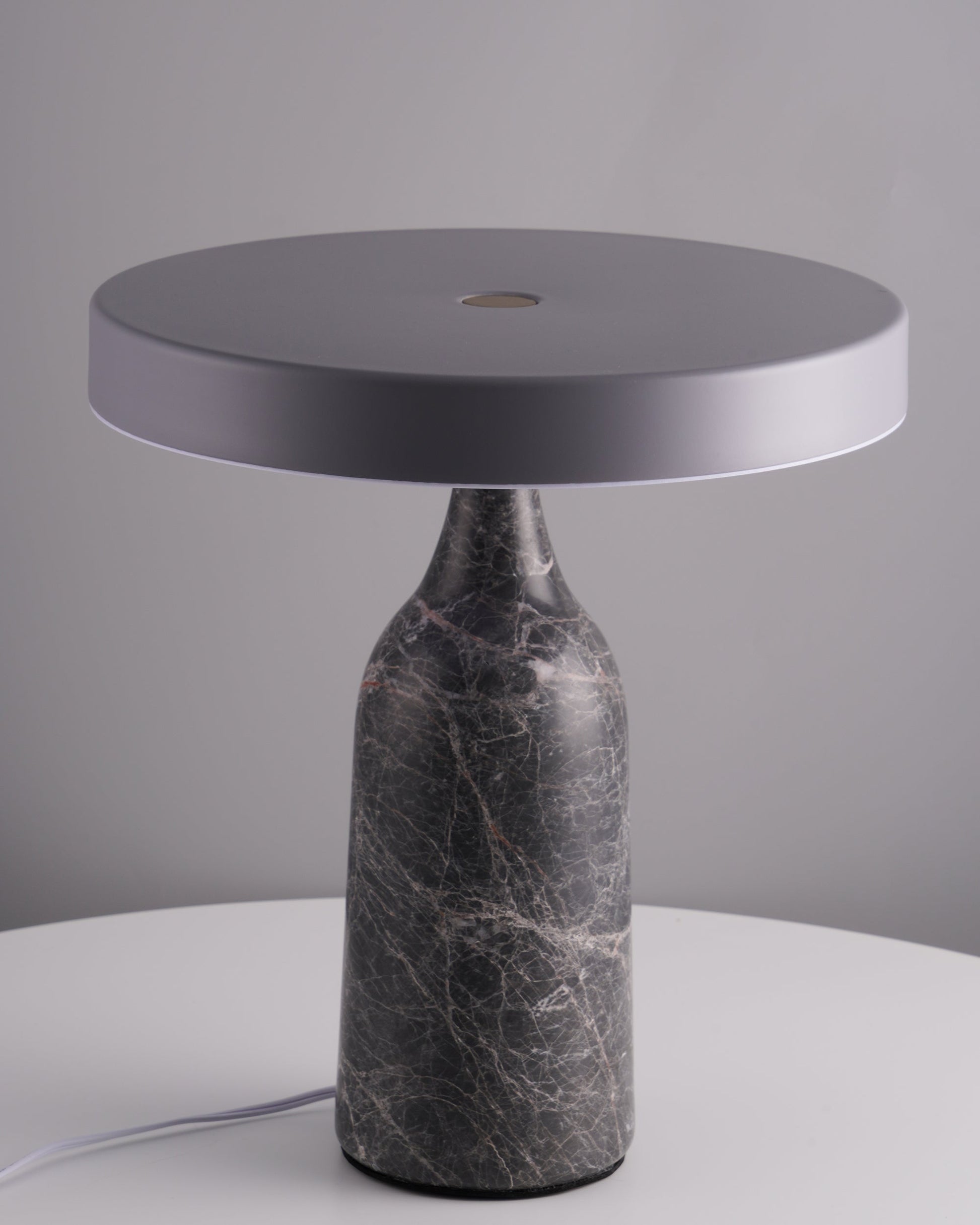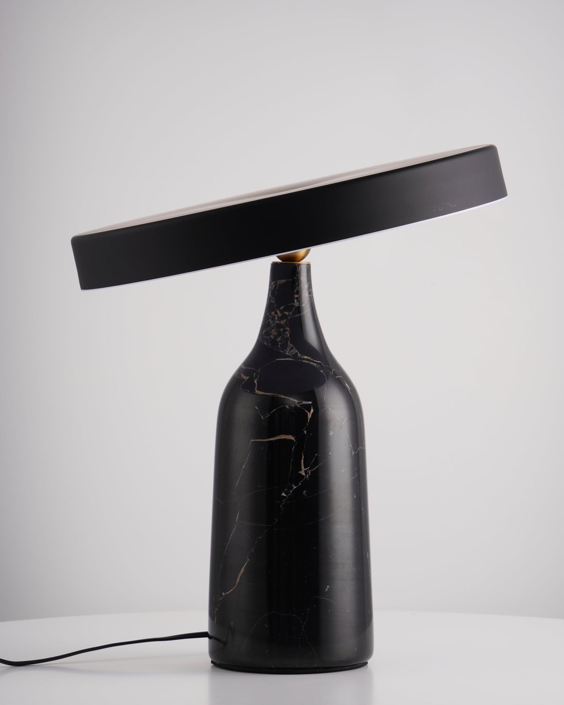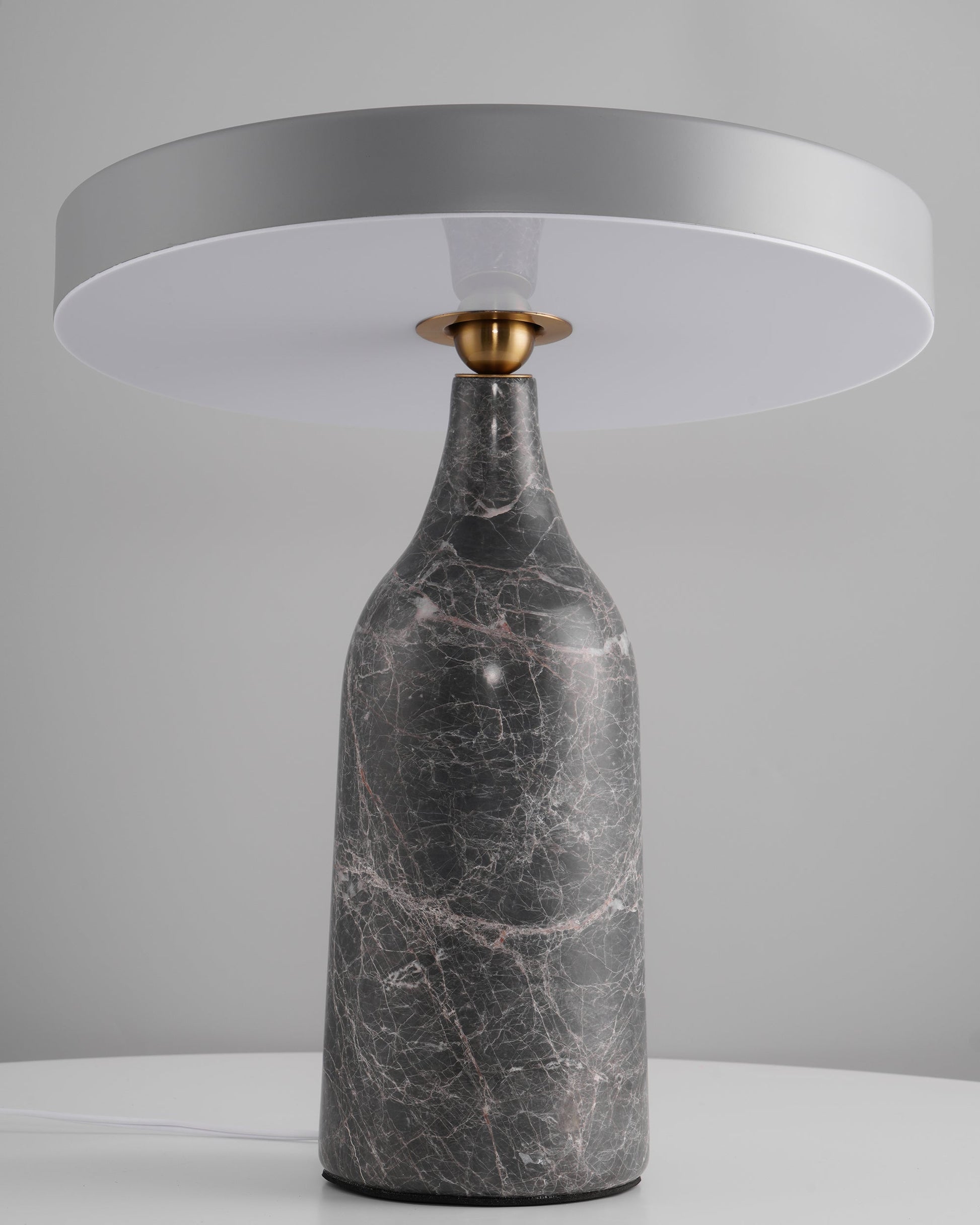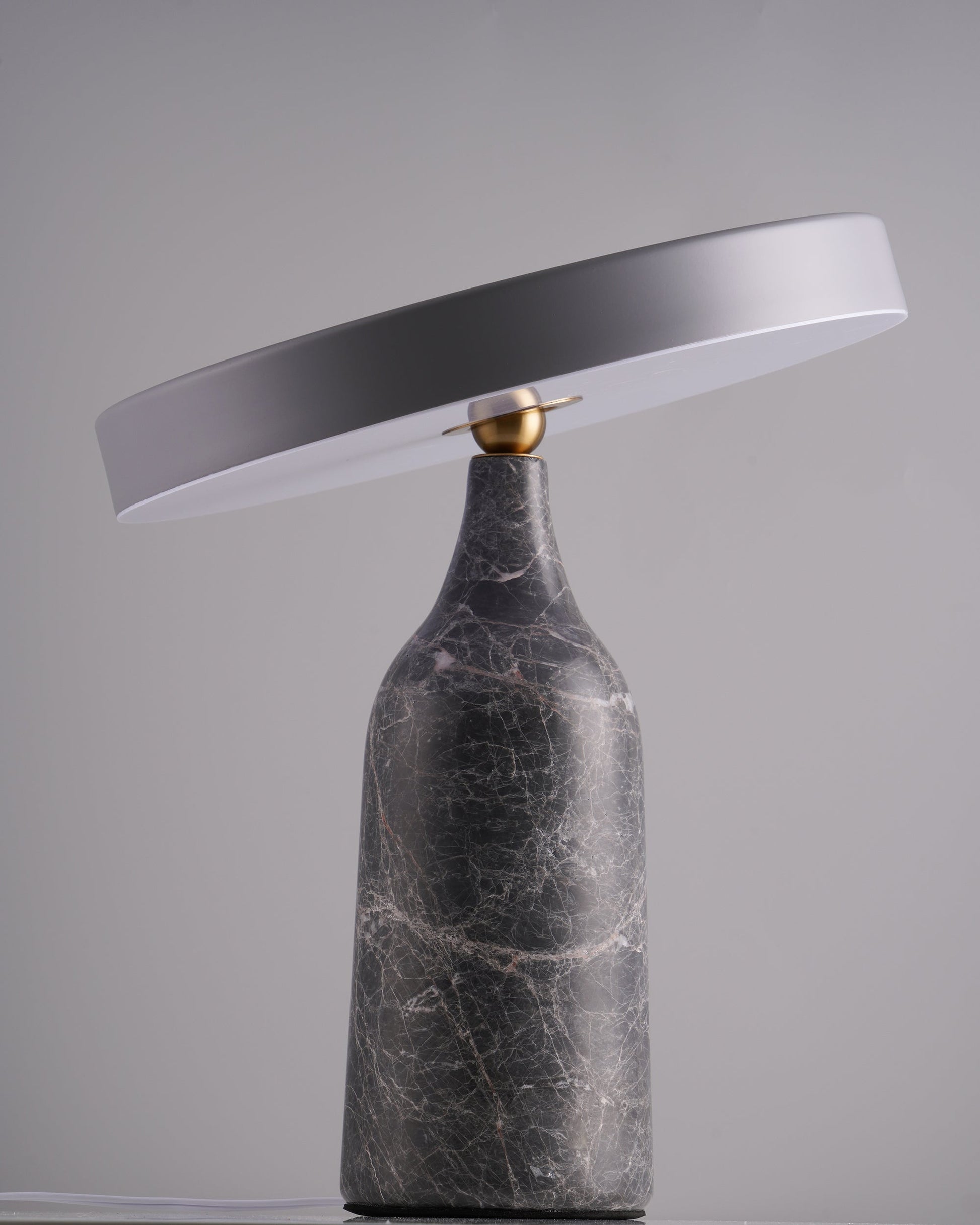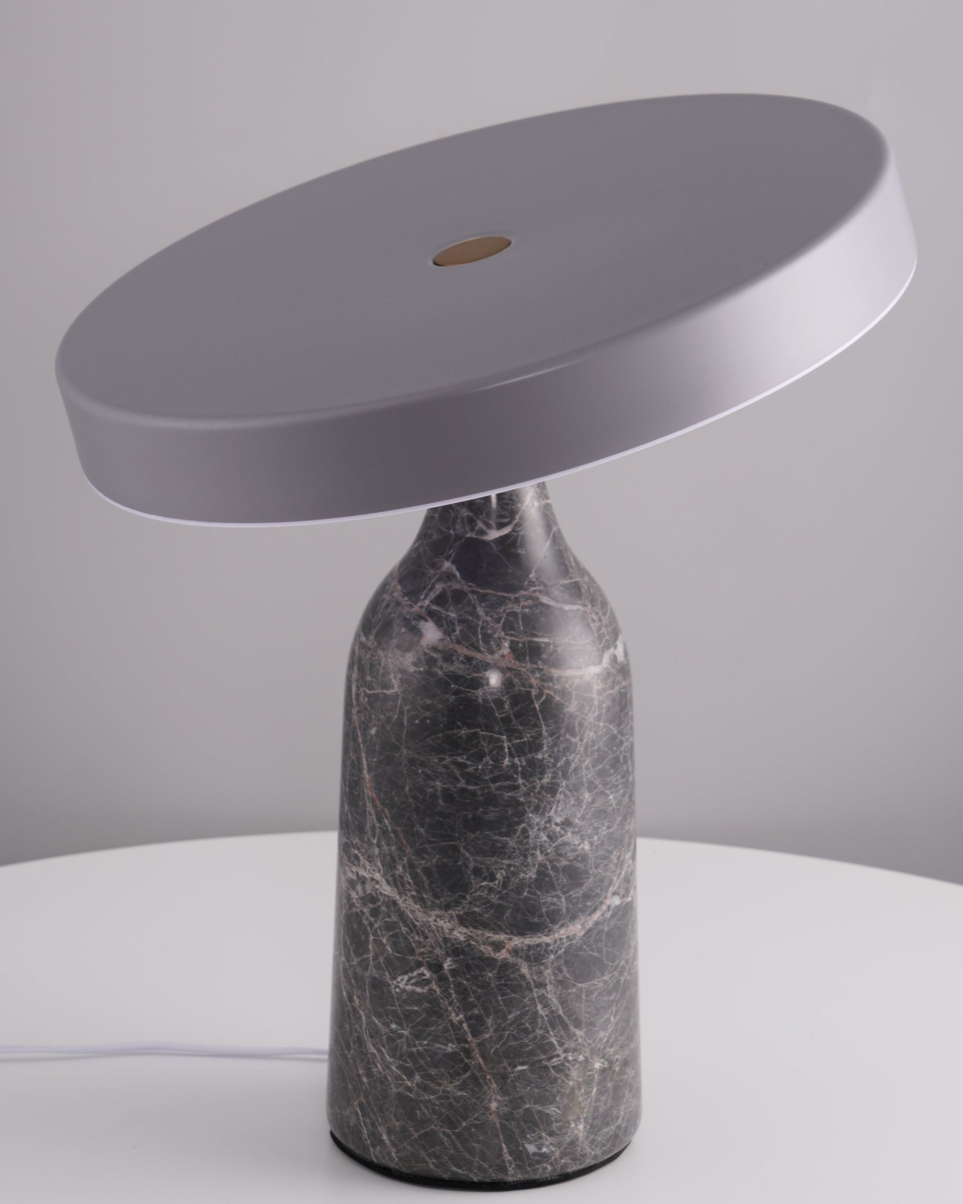 The EddyGlow table lamp combines a modern metal shade with a hand-turned marble base, creating a refined appearance. The innovative design features a rotating point where the lampshade can be tilted to direct the light beam as desired. This lamp adds a luxurious and elegant atmosphere to any space.