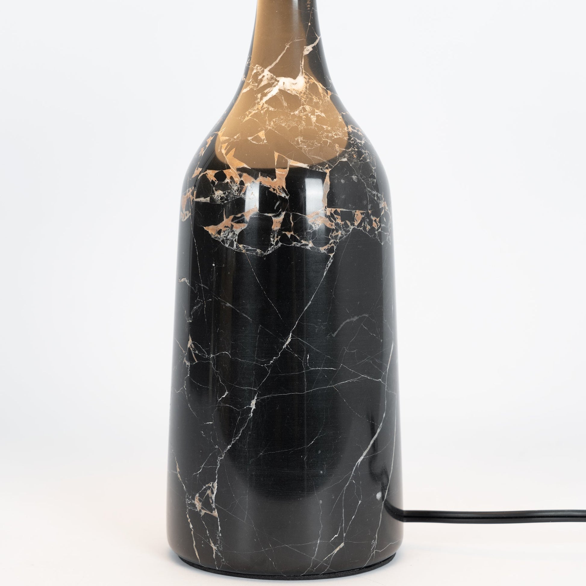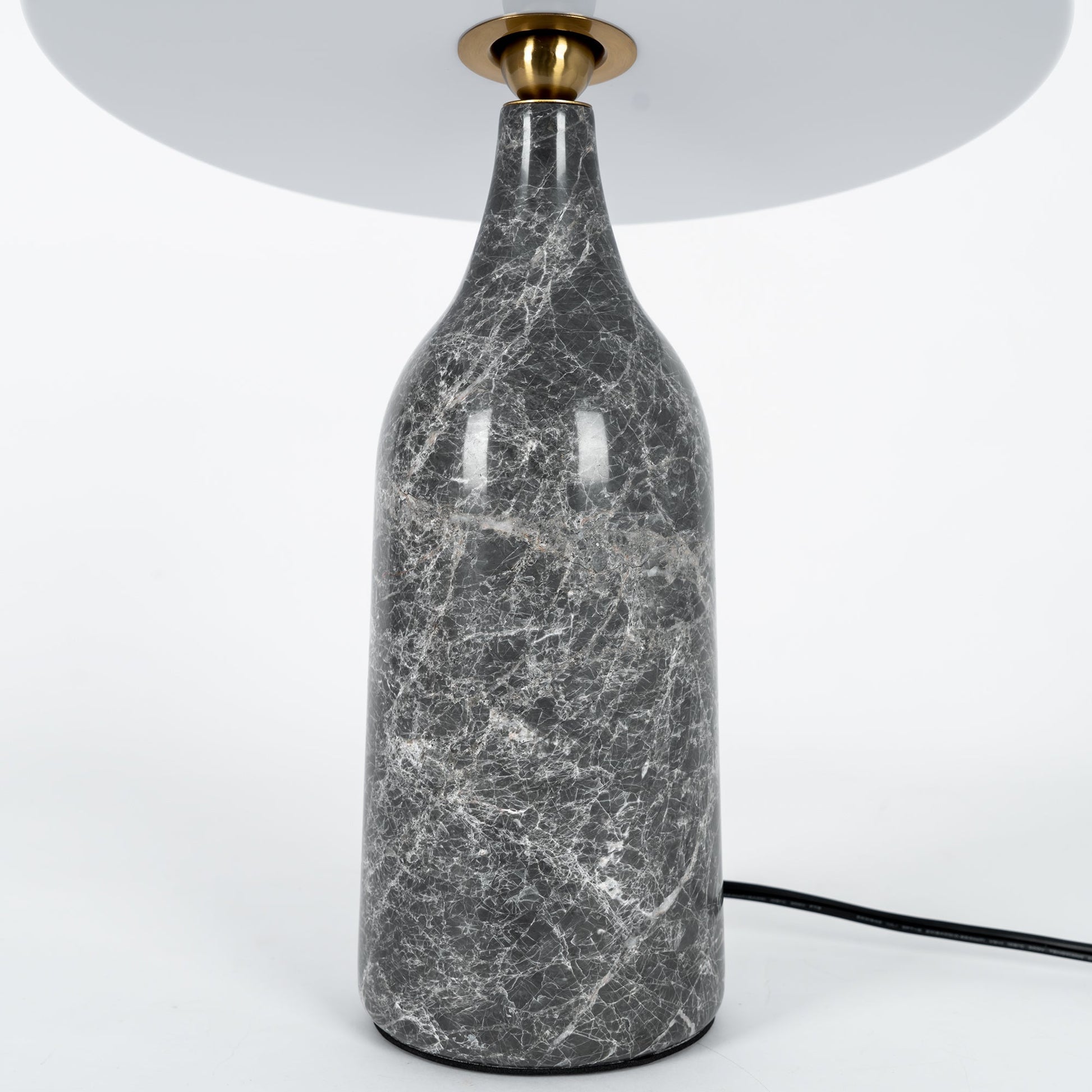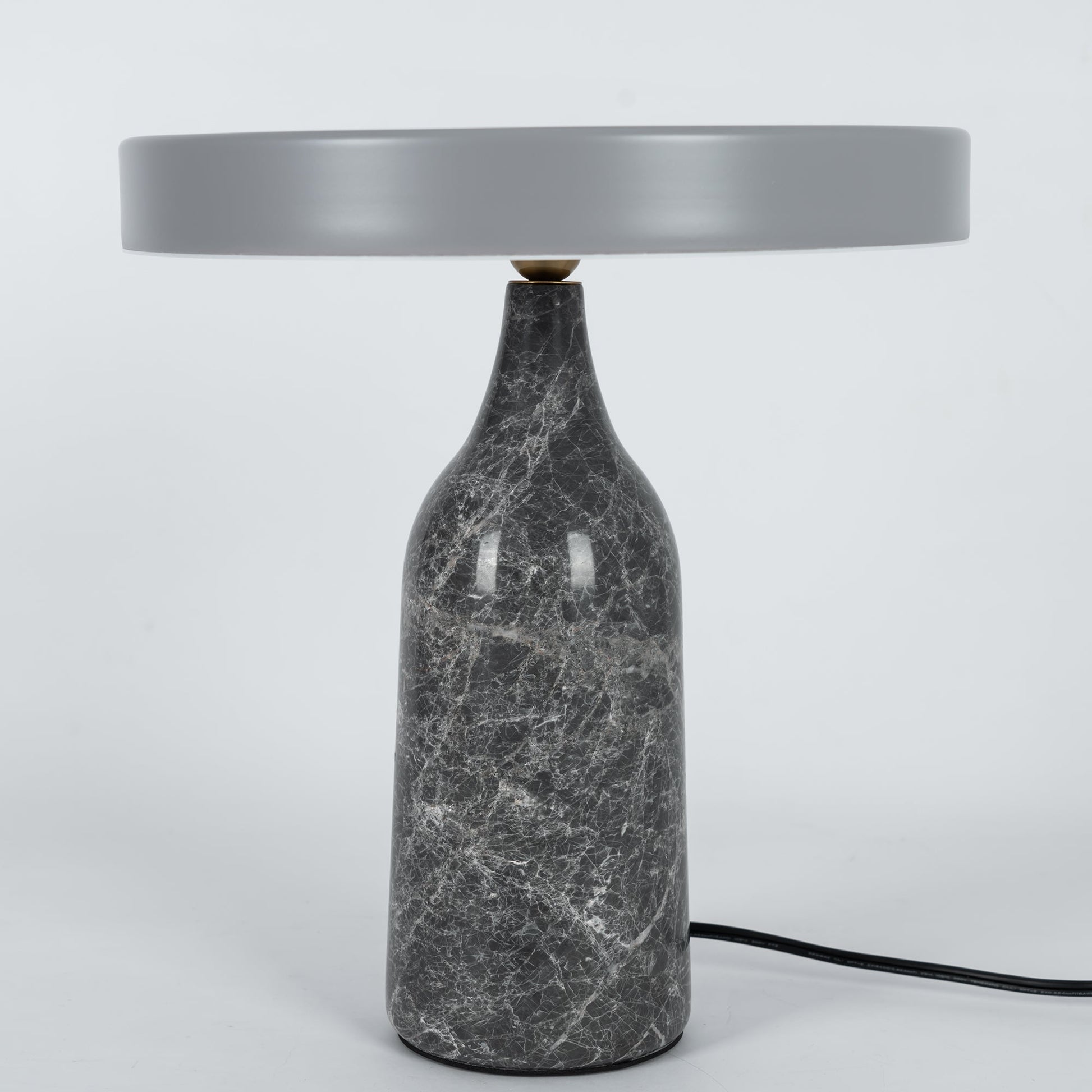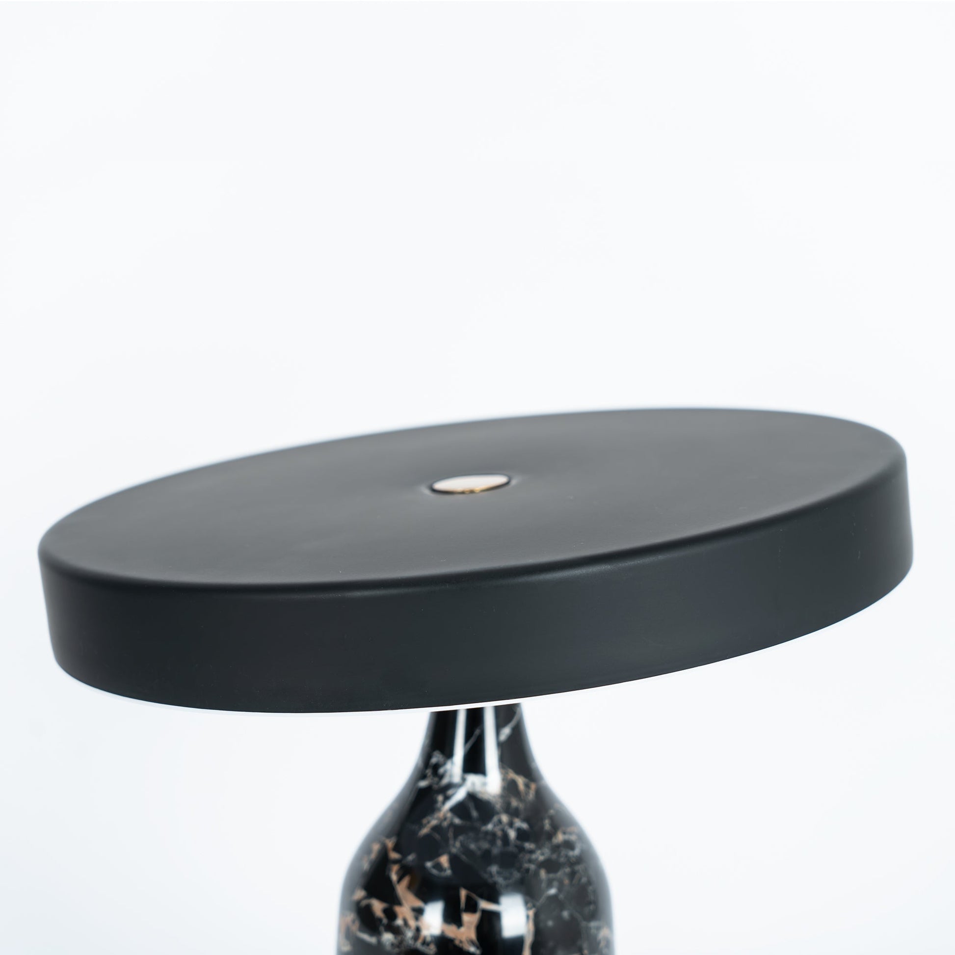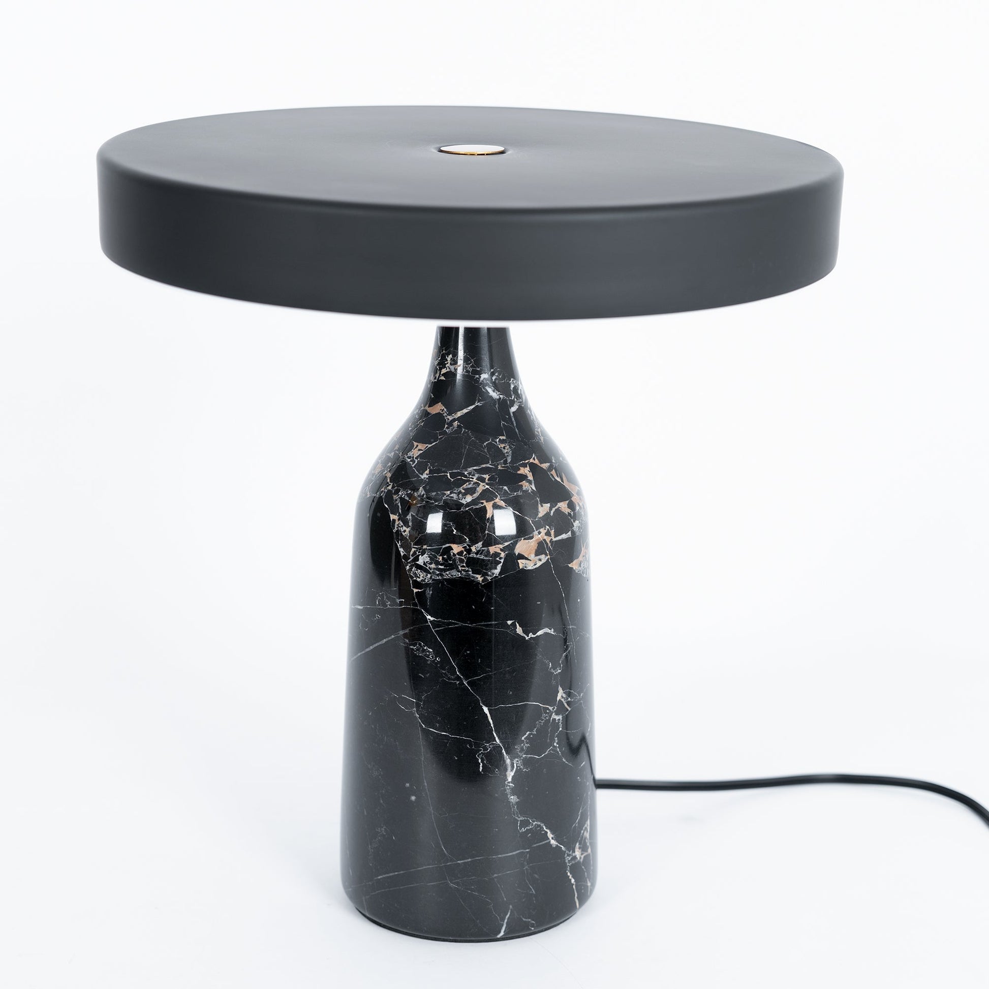 The EddyGlow table lamp combines a modern metal shade with a hand-turned marble base, creating a refined appearance. The innovative design features a rotating point where the lampshade can be tilted to direct the light beam as desired. This lamp adds a luxurious and elegant atmosphere to any space.