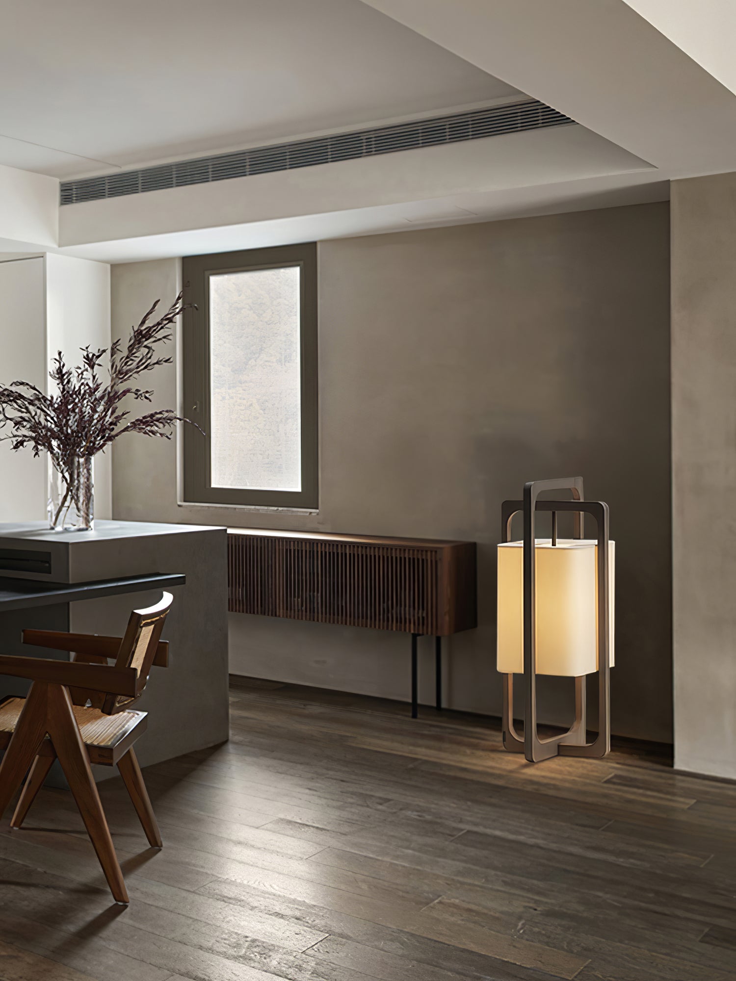 This contemporary and refined table lamp is named after a small nature reserve on the Channel Island of Lihou. The lampshade is made of cotton, while the frame is crafted from dark walnut wood with a varnish finish. The Lihou plays with perception through the use of perpendicular lines that almost seem to move. This elegant lighting element enhances and elevates any interior space it adorns.