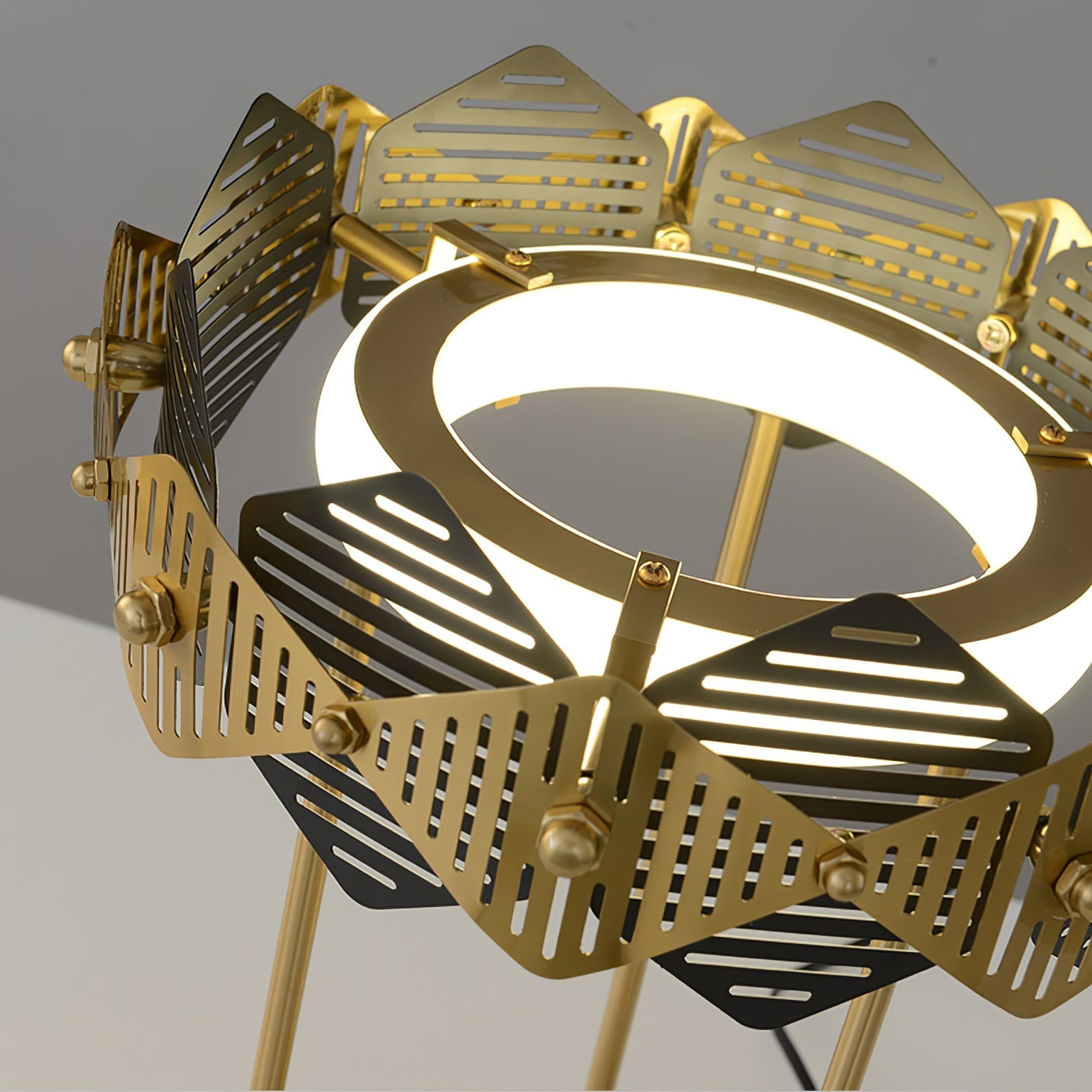 The LuxeCrimson Table Lamp is a refined version of the classic Crimson lamp, with a timeless design and luxurious appearance. The lamp is supported by three steel rod legs firmly attached to a metal cylindrical base. Light emanates from the central ring and is softened by the contrasting black and gold diamond-shaped slats, creating a cosy lighting effect.