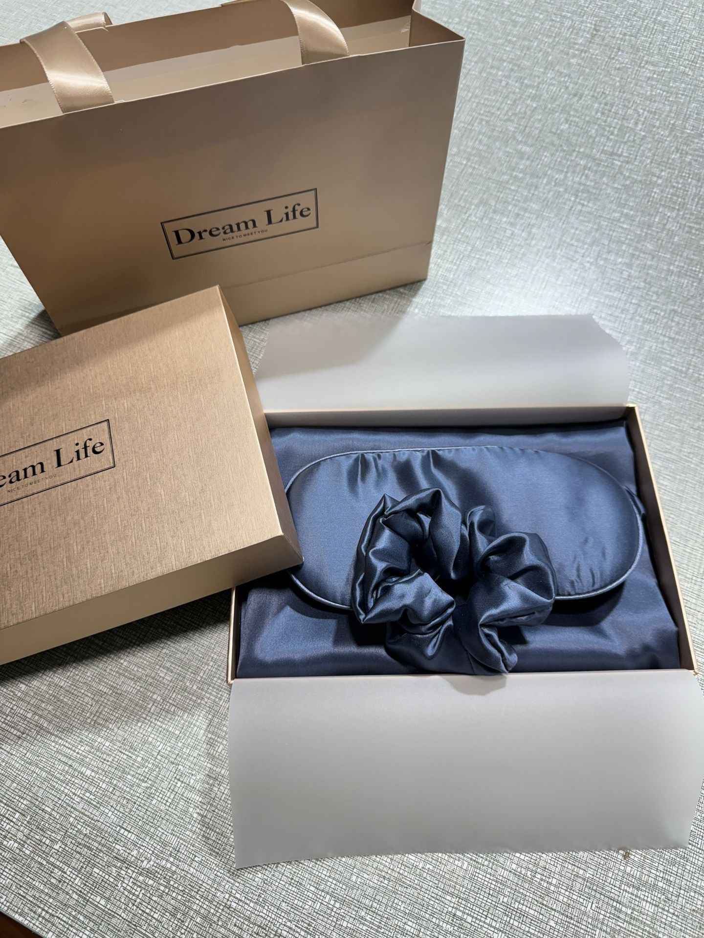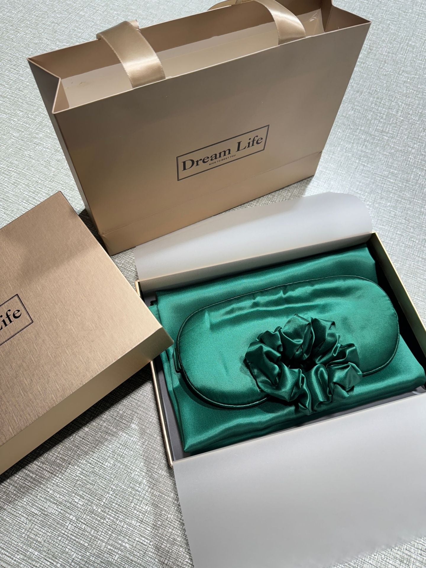 - Set Includes: Silk pillowcase, silk eye mask, silk scrunchie, premium gift box
